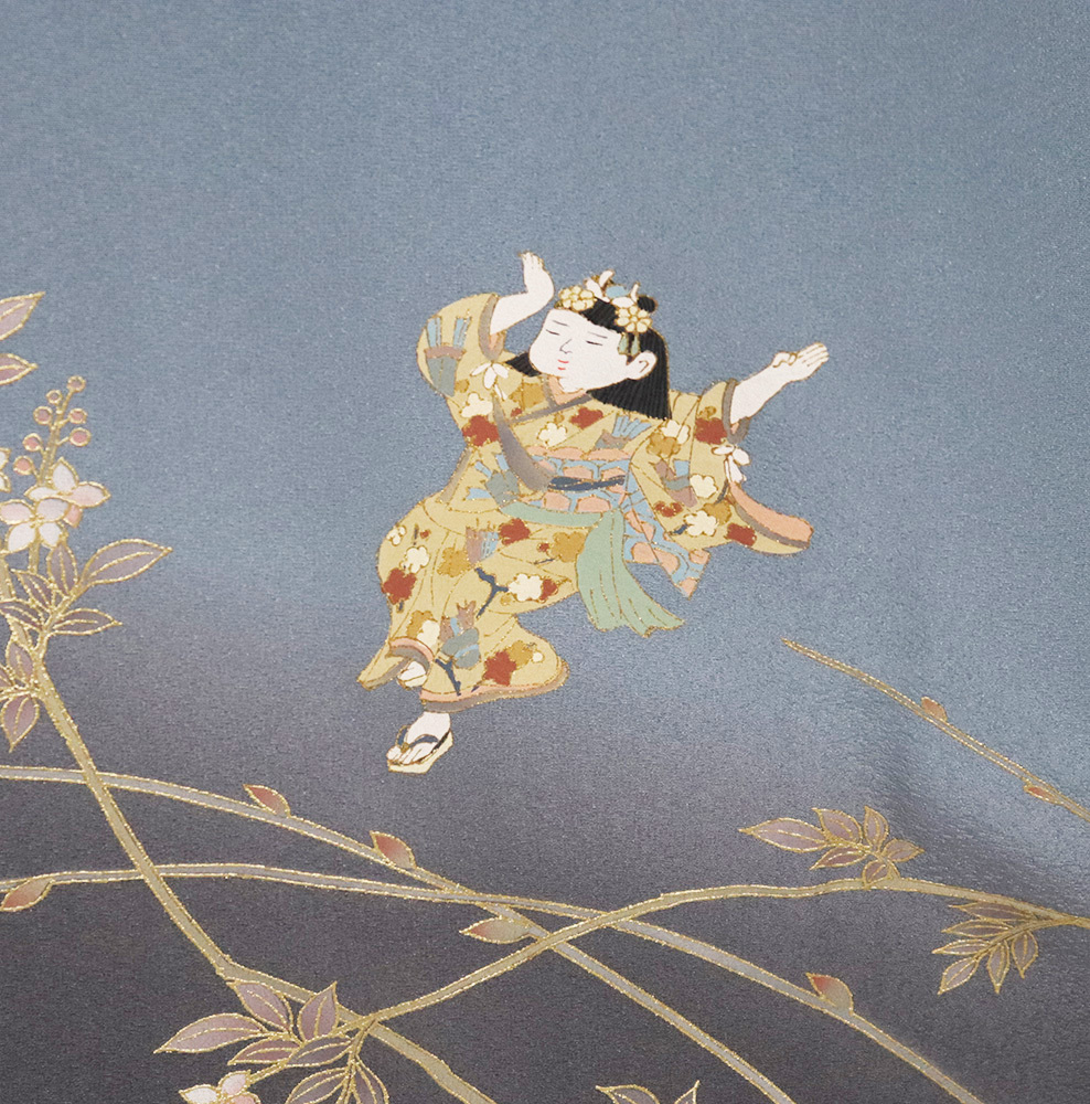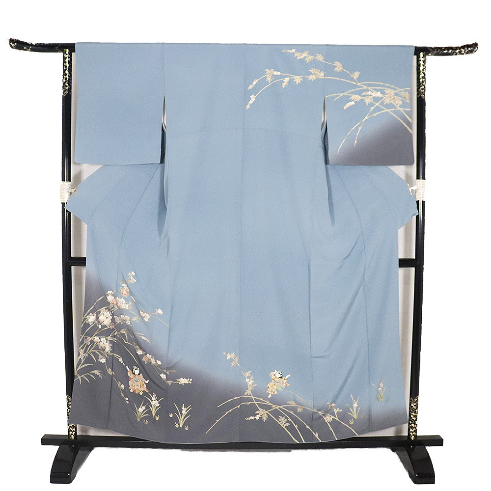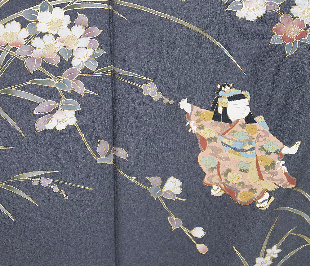 | 色・柄 | 訪問着 袷 丹後縮緬地 グレー(紺鼠色)・緑(褐色)・暈し地 桜・童 (写真では上手く色が出ない場合があります。ご了承下さい) |