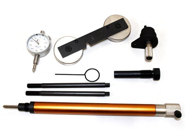 | 仕様 | 入り組み内容 A. ダイヤルゲージ B. TDC ポジショニングツール C. カムシャフト セッティング プレート D. テンショナー ロッキング ピン E. クランクシャフト ロッキング ピン F. ガイド ピン(2) G. カムシャフト セッティング ツール 梱包サイズ:W295×D195×H50 重量:1560g |