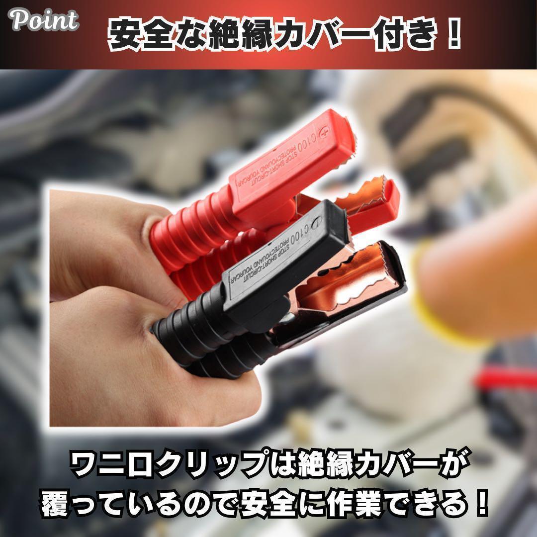 【製品詳細】 ・長さ:4m ・素材:PVC ・対応電圧:12V/24V 【使用方法】 1.救援される車のバッテリー「+」端子に赤ケーブルを接続 2.救援する車のバッテリー「+」端子に赤ケーブルを接続 3.救援する車のバッテリー「-」端子に黒ケーブルを接続 4.救援される車のエンジンルーム内の金属部分に黒ケーブルを接続 エンジン始動後、接続の逆順でケーブルを外してください。 |