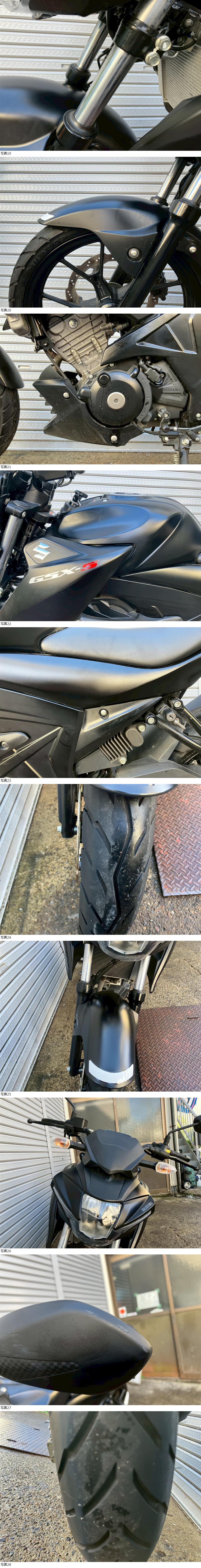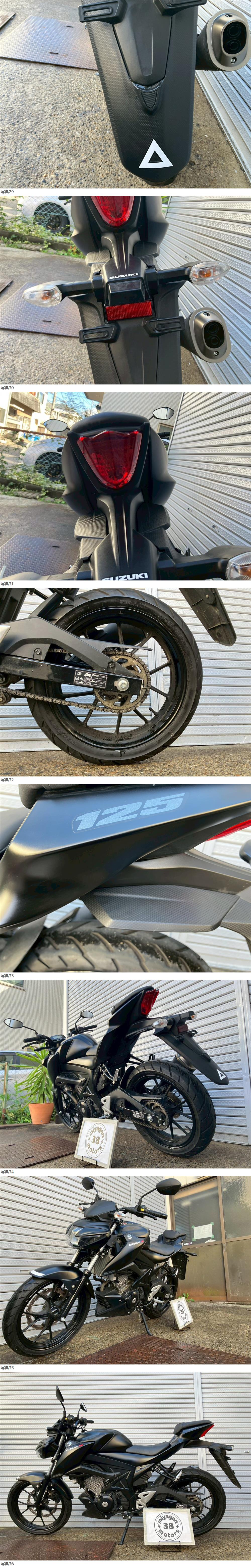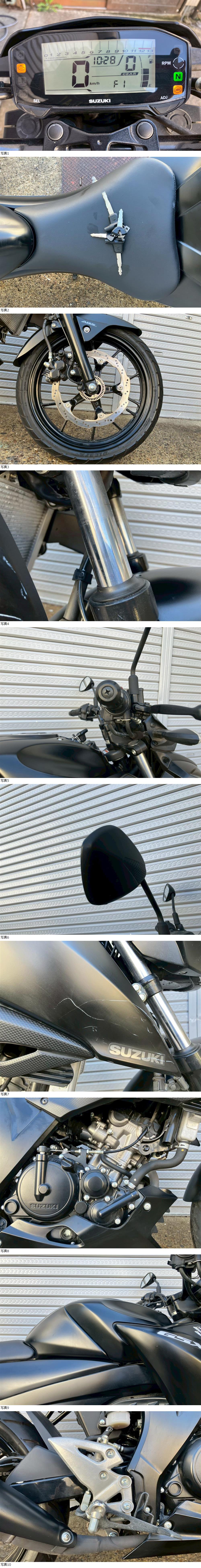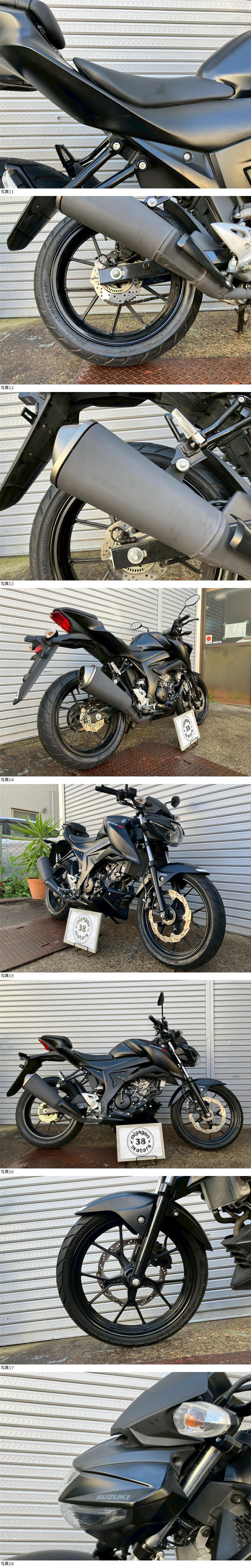 | 商品説明 | GSX-S125 3949㎞ この度は当出品車両をご覧頂きまして誠に有難う御座います。 他にも複数台出品がございますので宜しければご覧ください! ご入札頂けた際には文末にありますお取引詳細にご同意頂けたものとさせて頂きます。 下記車両詳細・お取引詳細になりますので必ずご一読くださいませ! また、直接お越しいただいた方にその場で販売することもあるため予告なしに出品の取り消し等をする場合も御座います。 よって、落札前には一言コメント欄にてご一報頂けますと幸いです。予めご了承下さい。 〜〜車両詳細〜〜 メーカー:スズキ 車種:GSX-S125 1オーナー 年式:2019年 色:黒 鍵:純正キー2本 排気量:125cc 走行距離:3,949km 燃料供給装置:インジェクション フレームNo:DL32B-101XXX 自賠責:なし 自賠責の加入も可能です! * * * 低走行のGSX-S125入荷いたしました! ・外観 目立つ傷割れはなく好印象な1台です! 状態は写真にてご確認ください。 ・エンジンセルにて始動O K! 吹け上がり良好! 確認箇所は以下となります。 スピードメーター:作動OK! ヘッドライト:ハイロー点灯! ウィンカー:前後左右点灯! テール:尾灯・ブレーキ共に点灯! ナンバー灯:点灯! ホーン:作動OK! ★別途部品交換受け付けます! ・タイヤ前後交換など!詳細は直接お問い合わせくださいませ! エンジンオイル・タイヤ交換など! 詳細は直接お問い合わせくださいませ! *上記ご利用の際は部品の在庫状況によりお引き渡しまでにお時間を頂戴する場合が御座います。 〜〜お取引詳細〜〜 ※ご注意ください※ 出品車両はあくまで現状販売となります。走行点検などは行っておりません。 良好・好印象などの表記に関しても車両の状態を確実に保証するものではなく 細かい程度の差なども含めあくまで当方の主観でありますこと重々ご承知置き下さい。 特別に気になる箇所など(外観に限ります)がある場合は直接ご相談ください。 ご指定いただきました箇所のお写真を添付をさせていただきます。 (あまりにも多い場合はご対応致しかねます。) 上記を踏まえまして現車の確認は大歓迎です。 細かい箇所など気になる方は是非とも現車確認を行ってください! (予約制となりますので直接お問い合わせください。) 一般の二輪販売店と同様の点検・整備は行っておりません。 車両に関する一切の保証等も御座いませんので自走でのお引き取りはお断り致します。 ある程度の知識があり落札後にご自身で整備の出来る方、或いは整備工場等にて分解整備を別途検討できる方、メンテナンスベースとしての使用などの落札を推奨しております。 明記してあること以外の確認はしておらず、また致しかねます。 目視できる消耗品以外のパーツに関しましても寿命のわからぬものなど御座います。 (中古品ですのでつい先程まで正常に作動していたにも関わらずお受け取りの際に状態の変化などある場合も十分御座います。例・電子機器、ワイヤー類など) 再三にはなりますが如何なる場合もお引き渡し後のキャンセル・クレームはお受け致しかねます。 現状販売というものを重々ご理解の上ノークレーム・ノーリターンでよろしくお願い致します。 原則キャンセルはお受け致しかねますが、止むを得ず落札者様都合でキャンセルされる場合には 落札金額の1割をキャンセル費用として頂戴させて頂きます。 上記取引内容に不安を感じられる方には二輪販売店等の整備・保証付き車両のご購入を強くお勧め致します。 ★直接引き取り・即引き取り大歓迎! 直接引き取りの場合、落札から1週間以内にお引き取り下さい。 それ以降日割りにて2,200円を別途頂戴させて頂きます。 *部品交換をご依頼の方は完成のご連絡から1週間以内となります。 ★配送OK! 主に配送業者に委託しております。ご自身で手配いただいても結構です。 レッドラインの金額を参考にしておりますのでお手数ですが費用に関しましては落札者様にて直接HPでご確認下さい。 発送元は埼玉県川口市となります。ご購入から配送までの目安は関東近郊で1〜2週間程度となるかと思います。(地域、期間により大幅に異なりますので納期が気になる方は直接レッドラインへお問い合わせ下さい。) 関東近郊の場合割増でお早めにお届けできる場合も御座いますので一度ご相談下さいませ!(対象外となる場合も御座います。) また、配送の場合もお取置き等の対応は致しかねますので落札後は速やかに配送依頼の手続きを行わせて頂きます。 ★車両のみの販売となりますので必要な場合のみ別途5,500円にて販売証明書の発行・発送を受け賜ります! ★新規アカウントの方、落札者様の評価内容によりましては、ご入札頂いても当方の判断で削除する場合がございます。予めご了承下さい。 ★落札後、24時間以内にお客様情報のご入力・落札代金のお支払いがいただけない方のお取引はキャンセルとさせていただきます。(お支払いに関しましては、どうしてもの場合大幅な期間でなければある程度ご相談にのらせていただきます。) 予