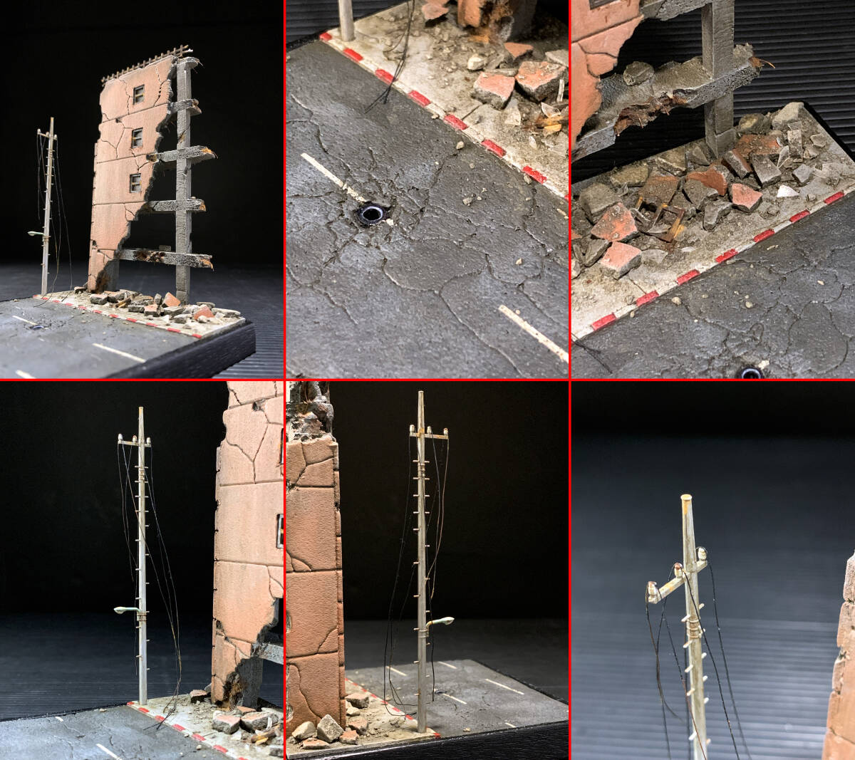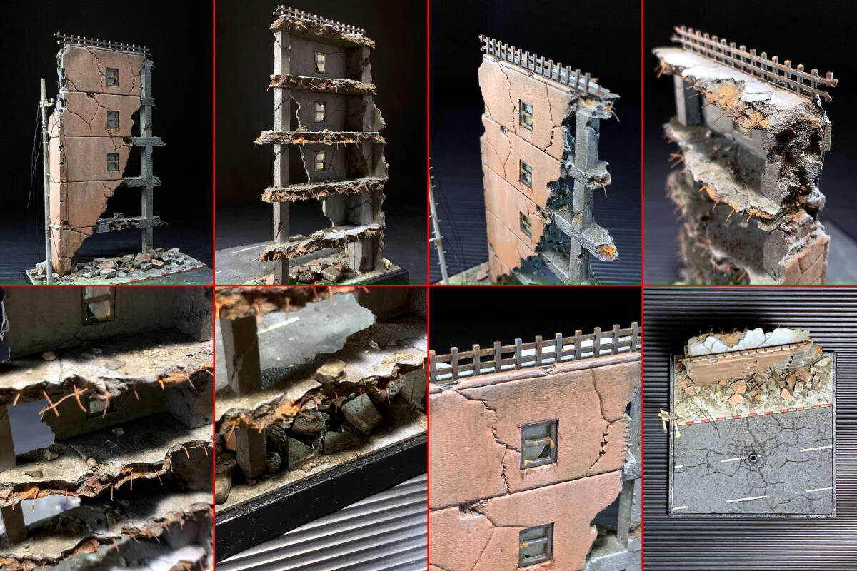 :ジオラマの大きさは台座を含めて105×105×145(横幅×奥行き×高さ。mm単位)程になります。 :使用した材料は、スチレンボード(複数種)、石膏、Nゲージ用品(複数種)、プラ材(複数種)、透明エポキシ樹脂、銅線、真鍮線、カタン糸、ジェッソ、ABSパイプ、木(複数種)などです。 :建物はスチレンボードとプラ材・銅線を組み合わせて制作。地面もスチレンボードから制作しています。 :窓枠を一つずつプラ棒で制作し、そこに割れたガラス(透明プラ板)を接着して廃墟感を演出しています。 :路面に散らばる割れたガラスを表現するため、細かく切り出した透明プラ板や、薄く伸ばして整形した透明エポキシ樹脂を砕いたものを蒔いています。 :路面の縁石は海外でたまに見かける紅白模様(国内にあるかは未確認)に塗装し、アクセントとしています。また道路標識の破線間隔も国内基準とは違い、幅が狭いものにしています。 :電柱や廃ビル屋上の柵はNゲージのものを使用。電線はカタン糸に接着剤を染み込ませてクセを作っています。 :彩色は全て水性塗料で塗装しています。また各部のウェザリングは油彩塗料を使用しています。 :台座は加工整形後に、アサヒペンの水性スーパーコート(つや消し黒)で仕上げています。 :塗装は全て、筆塗りによる手作業です。そのため多少のムラが生じる場合がございますが、味だと思っていただければ幸いです。 |