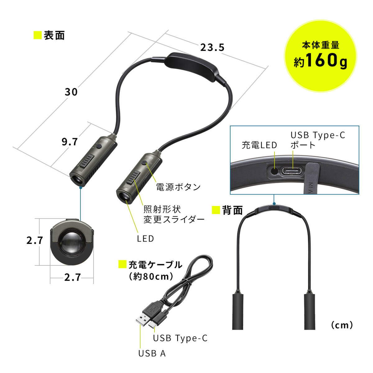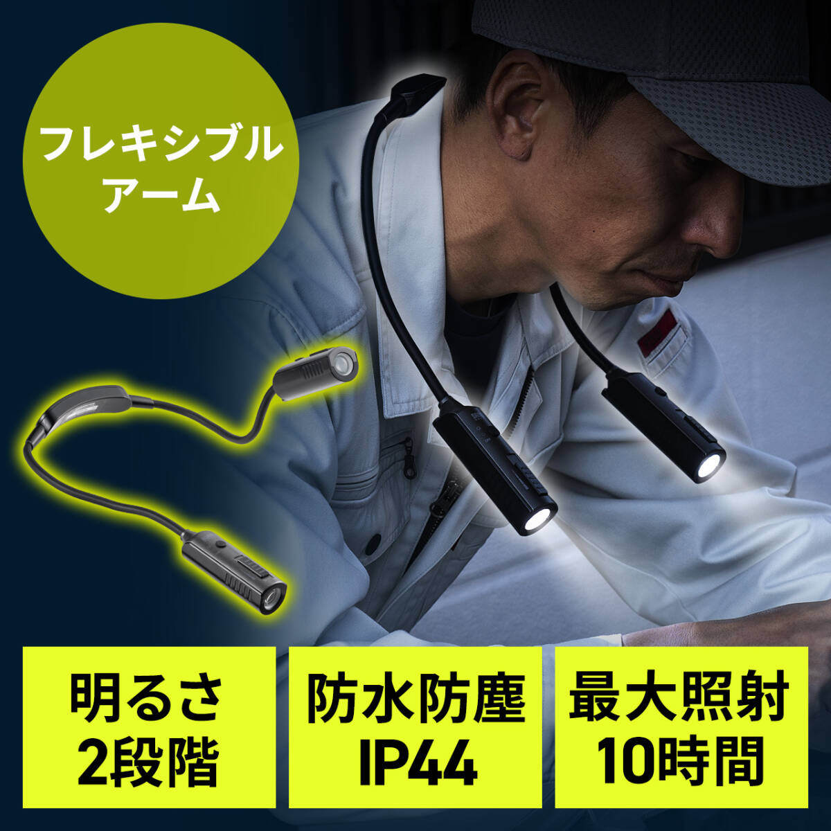 ネックライト 首掛け式LED USB充電式 作業用ライト 防水規格IP44 最大120ルーメン フレキシブルアーム ブラック★800-LED083BK★送料無料です。 特長 ●ハンズフリーで使える首掛け式のLEDライトです。 ●首掛けアームは、左右それぞれフレキシブルアームで照らしたい位置に調整できます。 ●LEDの照射はスポット・ワイドで照射サイズの切替が可能です。 ●LEDライトは左右独立しているので、片方のみの点灯も可能です。 ●明るさは最大約120ルーメンで、調光は2段階調整ができます。(LEDライト1個あたり) ●LEDライトはUSB充電式で、充電時間は約2.5時間です。 ●防水防塵規格IP44を取得しています。 | |||