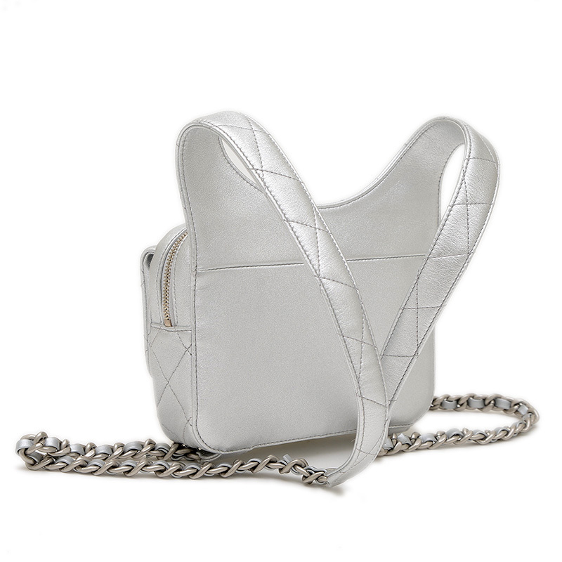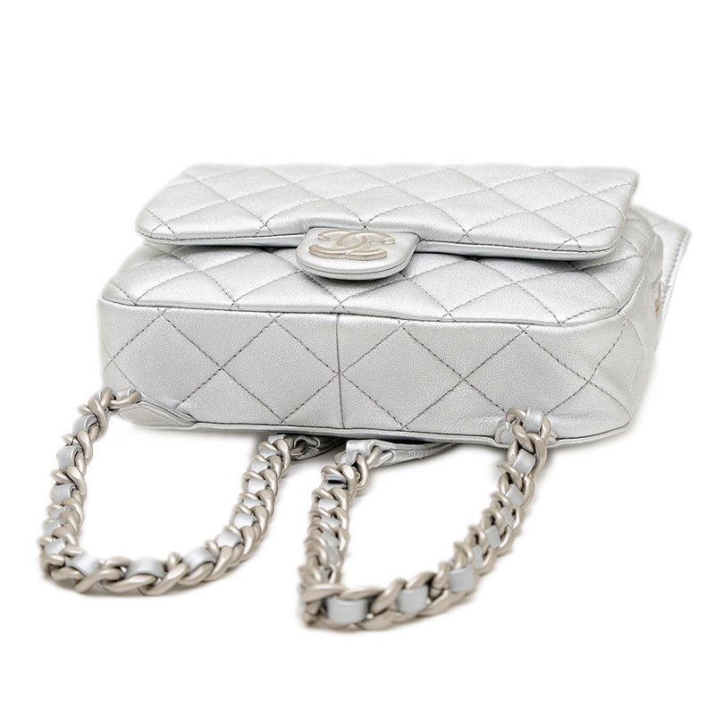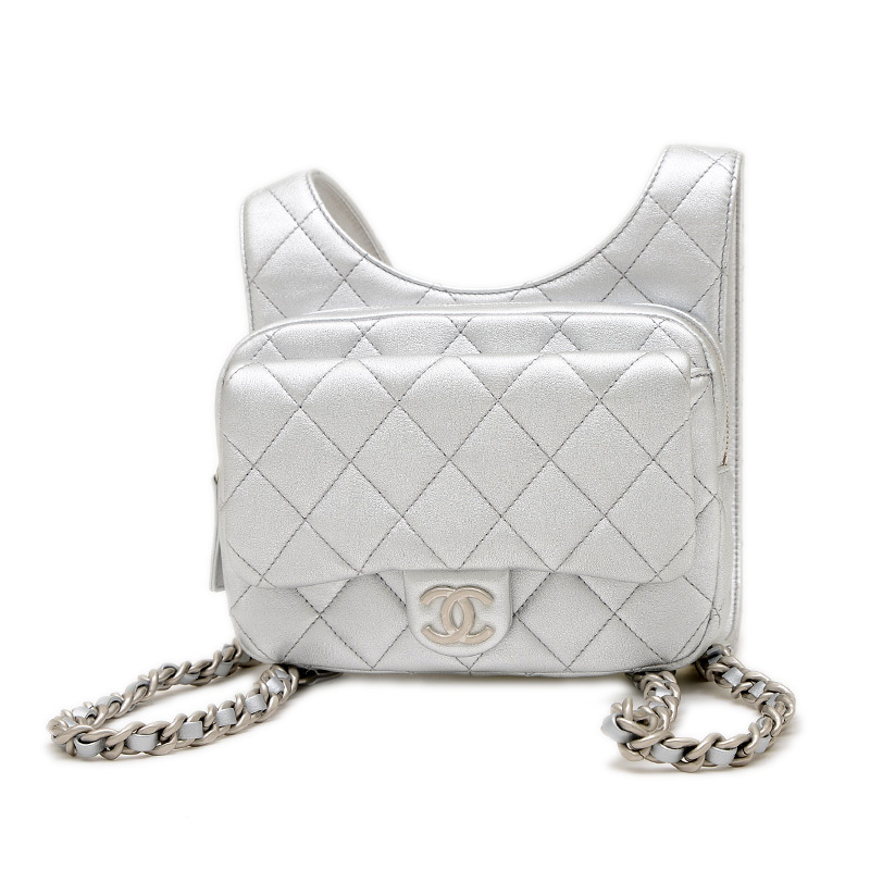 | 商品特徴 | ふっくらとしたキルティングが施されたメタリックシルバーカラーのレザーが特徴的なバックパックです。クールなシルバー金具と、アイコニックなCCロゴのクラスプがエレガントなアクセントになっています。コンパクトなサイズ感ながら、日常の必需品を収納できる実用性を備え、カジュアルなアイテムながらもシャネルらしい洗練された高級感を演出する人気の逸品です。 |