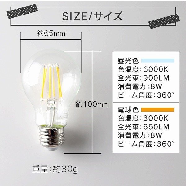 省エネ&長寿命のLED電球! 本商品の発光色は… ・落ち着いた雰囲気「電球色」 オシャレなレストランやBar、サロンなどにぴったりです。 電気料金の節約にもなるのでオススメです。 【商品仕様】 内容:本体×10個 サイズ:(約)65×100mm 重量:(約)30g 全光束: 電球色:650LM 消費電力:8W 口金:26E ビーム角度:360° |
