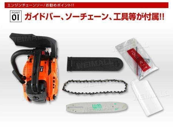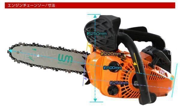 軽量化されたデザインで、エンジンの始動性を高めた、初心者にも扱いやすい! 薪作り、伐採作業まで幅広くお使い頂けます! お庭、公園、農地や果樹園などで活躍します! 【商品仕様】 ・2ストローク 空冷式 ・排気量:25.4cc ・ガイドバーの長さ(約):25cm(10インチ) ・燃料:混合物(ガソリン:2 ストロークオイル25:1) ・燃料タンク容量:310ml ・オイルタンク容量:210ml ・キャブレター:バルブ式 ・潤滑システム:調節器が付く自動バルブ(本体潤滑) ・サイズ(約):幅25cm×奥行き22.0cm×高さ25cm ・重量(約):3.6kg ・カラー:オレンジ 【商品内容】 ・本体 ×1 ・ソーチェン ×1 ・ガイドバー10インチ ×1 ・ガイドバーカバー ×1 ・工具 【注意事項】 ・本商品を使用した際に発生したトラブル、事故につきまして、当社は一切の責任を負いかねます。 ・当商品は入荷の時期によりカラー、仕様などが変更される場合があります。ご了承下さい。(色指定はできません。) 商品コード:AA07C |