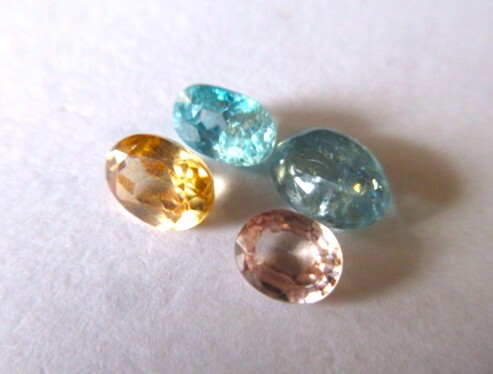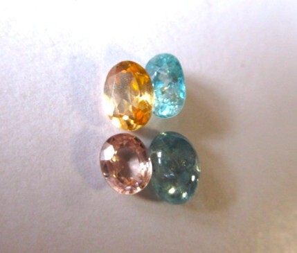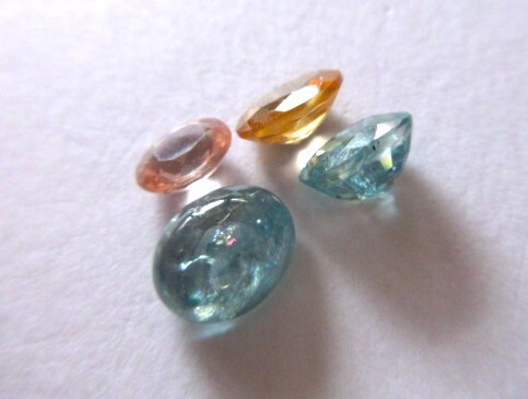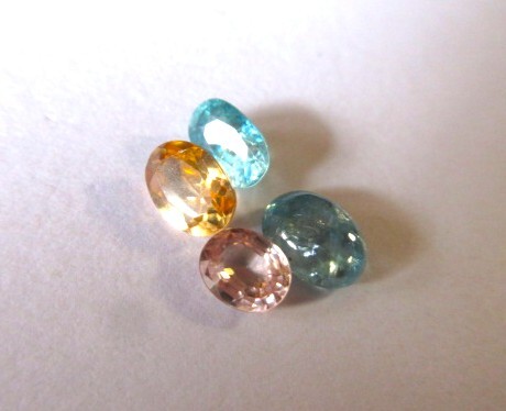 水色のファセット・ジルコン、珍しいカボーションの水色ジルコン、淡いピンク・ジルコン、落ち着いたイエローのジルコン、色味の違うジルコン4点です。インクルージョンがありますが、透明感とテリがあります。単純加熱、非加熱。