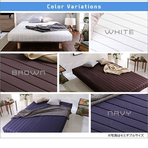 | 【ポイント】 「新発想」の一体型 脚付きロールマットレス SSサイズ。 フレームがないデザインだから、ライフスタイルを選びません。 D・SDサイズと組み合わせて家族で並んでおやすみいただくことも可能です。 ソファ使いも! 爽やかなホワイト、落ち着いた温かみのあるブラウン、シックなネイビーの3色からお選びください。 通気性と耐久性に優れた頑丈設計です。 ふんわり柔らかい寝心地のポケットコイルマットレスです。 ロール梱包でのお届けなのでお部屋までスムーズに搬入できます。 組み立ても簡単。届いたその日から快適睡眠ライフを! |