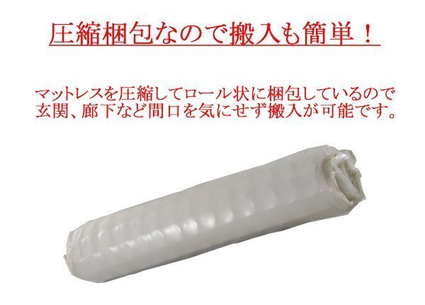 | 商品紹介 | ●肌触りも良く、調度良い適度な弾力性のマットレスです。 ○マットレスは、高級ポケットコイルマットレスを厳選しており、通気性の良いハイグレードな生地を使用!! ●適度な硬さで心地よくリラックス出来ます。 ○このマットレスは、1813個のポケットコイルを使っており、体に適度にフィットする機能を持ち、疲れた体を十分にほぐしてくれます。 【コイル数】 1813個 【コイル線径】 ポケットコイル約1.2mm ポケットコイル(中央部分)約1.4mm 【重量】 約34kg ●両面使用可能です。2ヶ月ごとに使用面をかえて頂くことで、マットレスを最良の状態に保ちます。 ○圧縮梱包ですので搬入も簡単。開梱後、お使いの場所へ置いて頂くと復元します。 ※ご注意 ●開梱の際にカッター等を使用するとマットレスを傷つける恐れがございますので、ハサミをご使用下さい。 ○一度開梱しますと元の圧縮状態には戻りません。 ≪梱包サイズ≫ ◇マットレス…約W33x約D33x約H166(cm) ※コンパクトな圧縮梱包です。 |