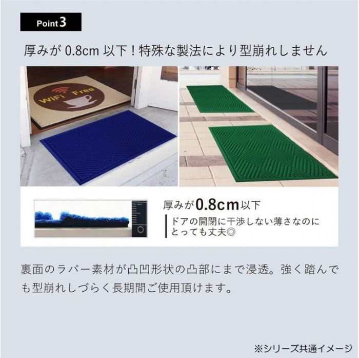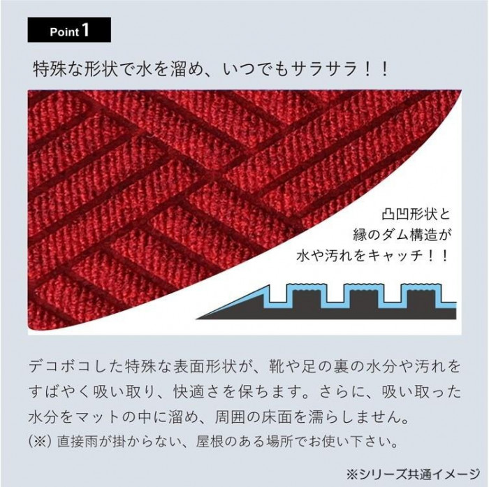 | 特殊製法による凹凸形状で立体的に水分や汚れを掻き取る業務用設計の玄関マット。キャッチした水分の85%が1時間後には乾燥、速乾タイプなので雨の日用マットとしても最適です。ベランダやデッキ、洗面所やバスマット等、様々な場面でお使いいただけます。屋内・屋外兼用。※ 直接雨が掛からない、屋根のある場所でお使い下さい。 ※商品サイズは製法上、若干の誤差が発生します。 ※写真の色合いと実際の商品の色味は異って見える場合がございますので、予めご了承ください。 |