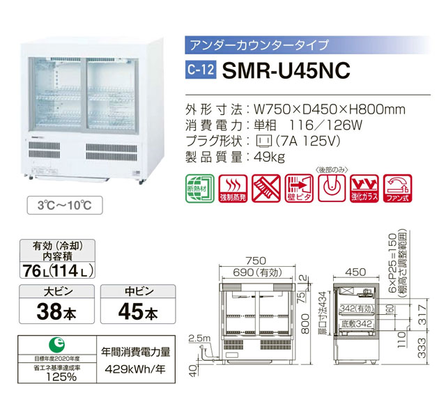 パナソニック テーブル形冷蔵ショーケース SMR-U45NC を出品いたします。 ■特徴■ 省スペース設置が可能な アンダーカウンタータイプ 側面フラット、背面壁ピタタイプの アンダーカウンタータイプ 安全に配慮した割れにくい 強化ガラスを採用 ドレン強制蒸発方式の採用で ドレン皿の排水処理作業を軽減 ■仕様■
