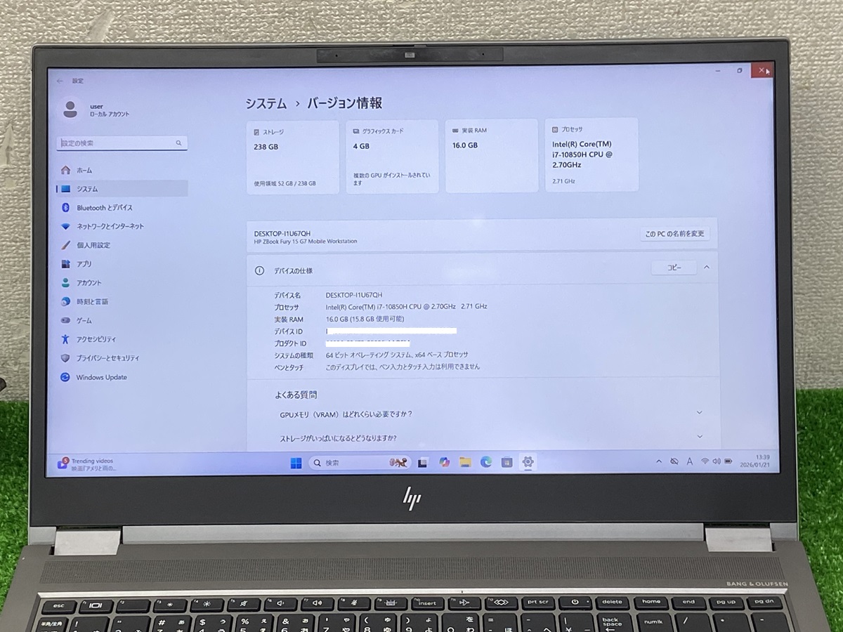hp zbook fury 15 g7 mobile workstation i7-10850h メモリ16GB ssd256gb ノートパソコン中古 Windows 11 カメラ NVIDIA Quadro T2000