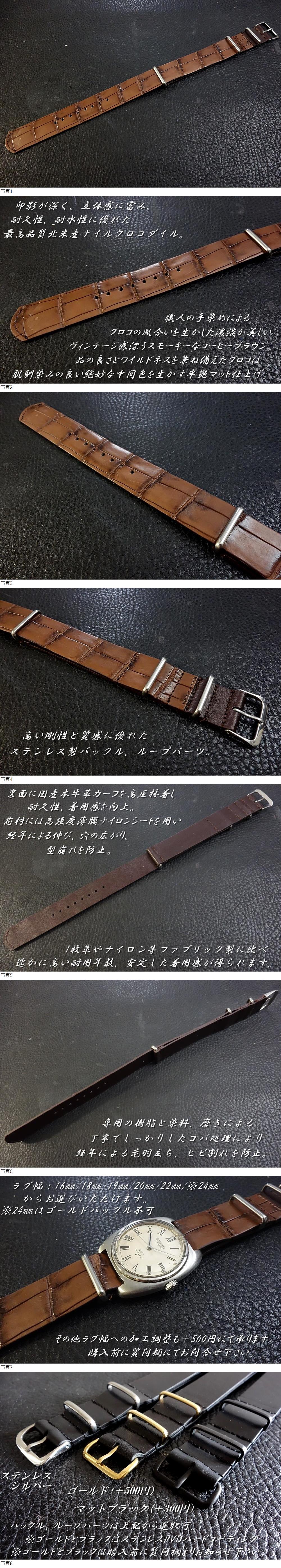 | ◆クロコダイル NATO G10 Strap◆北米産本クロコダイル コーヒーブラウン カスタムオーダー(ラグ幅/バックルカラー) 受注製作 (納期10日前後) |