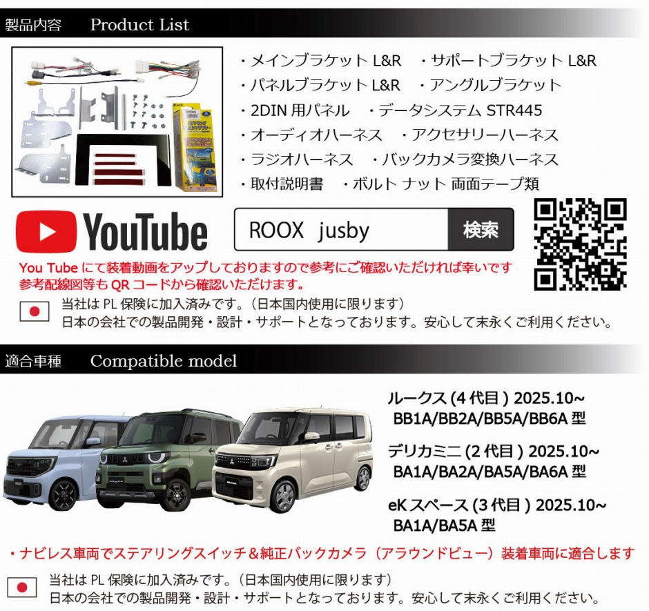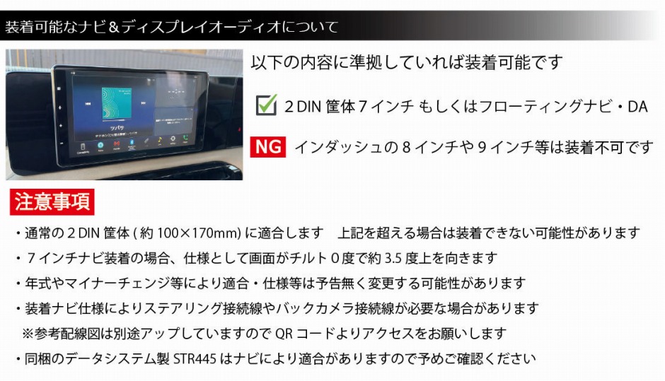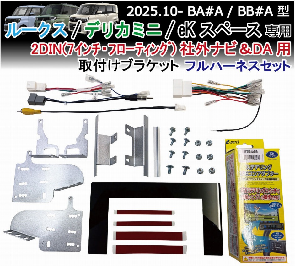 | ルークス・デリカミニ・eKスペース用 2DIN フルハーネスセット 社外ナビ / ディスプレイオーディオ 取り付けブラケットキットです。 2025.10月.発売のROOX / DELICA MINI / eKスペース(BA#A/BB#A型) オーディオレス車両に社外ナビやディスプレイオーディオを装着可能にする専用取付ブラケットキットです オーディオレスで購入するとナビパネルに大きく隙間空いてしまいます、また純正ブラケットでの取付けは社外ナビやフローティングナビの画面が走行中に振動・共振してしまう為、ブラケットから開発しました 一切の車両側加工不要で純正復帰可能な取付キットとなっており、今後のナビ周りの仕様変更等にも対応可能です 当キットでは「ステアリングリモコン」・「純正バックカメラ(アラウンドビュー)」も対応可能な変換ハーネス類がセットになております 装着方法や配線図は専用リンクページにてご案内しております(画像QRコード参照) 当商品は1年間の保証付きです。保証書は付属しません注文番号で保証対応可能です またPL保険も加入済みです。(日本国内使用に限る) 注意事項 ・画像注意事項を参考にしてください ・通常の7インチ・7型画面はチルト0度で約3.5度上を向きます ・バックカメラやステアリングスイッチはグレードなどにより装備が異なりますのでご注意ください ・別途ハーネスなどが機種により必要となります。参考配線図を参考にお客様にてご確認ください |