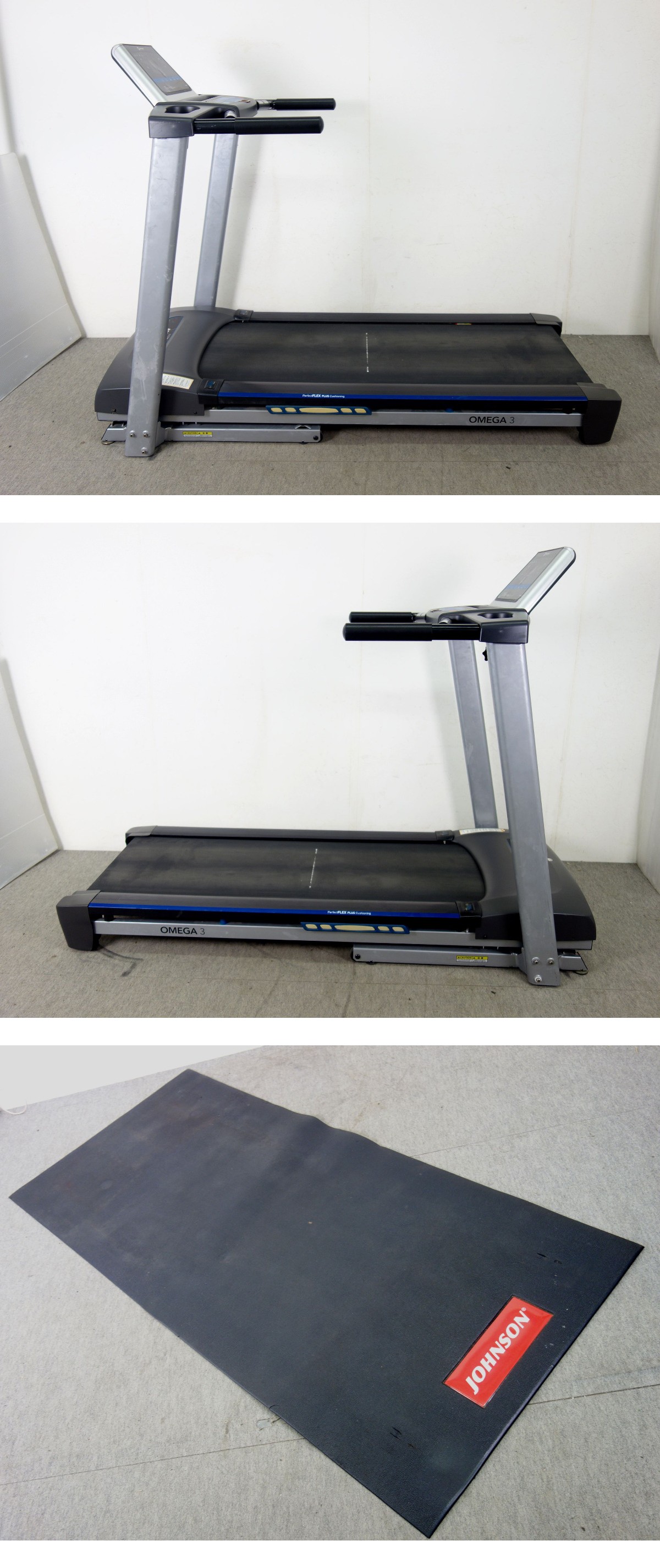 JOHNSON ジョンソン HORIZON ホライズントレッドミル OMEGA3 オメガ3 速度:0.8~18.0km/h 耐荷重:136kg 走行面:510×1400mm サイズ(約) 外形寸法:(約)W850×D1790×H1340mm 折り畳み時寸法:(約)W850×D1160×H1550mm 重量:83kg 付属品:本体・安全キー・取扱説明書・マット 動作確認・除菌クリーニング済みですが 落ち切れない汚れ・傷等はご了承ください。 マットに若干の切れ・ヨレがございます。 画像は撮影時及びPC環境設定により、異なる場合がございます。予めご了承ください。 画像を多数掲載しておりますので、PCにてご確認・ご参照くださいますようお願い致します。 携帯電話・スマートフォンでは、ご覧いただけない場合がございます。