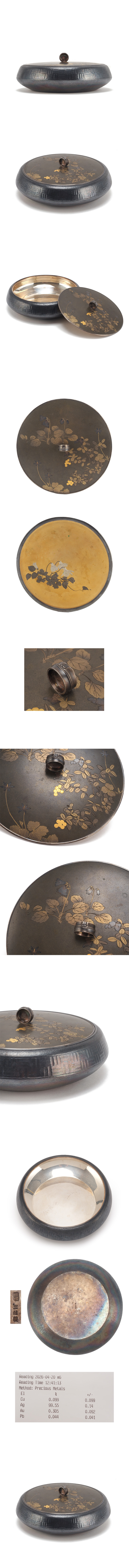蓋は緑青(サビ)しみ、スレ、汚れ、 作成時にできたへこみや、いくつかのアタリがあります。 身はしみ、スレ、汚れ、いくつかのアタリ、銀特有の変色があります。 |