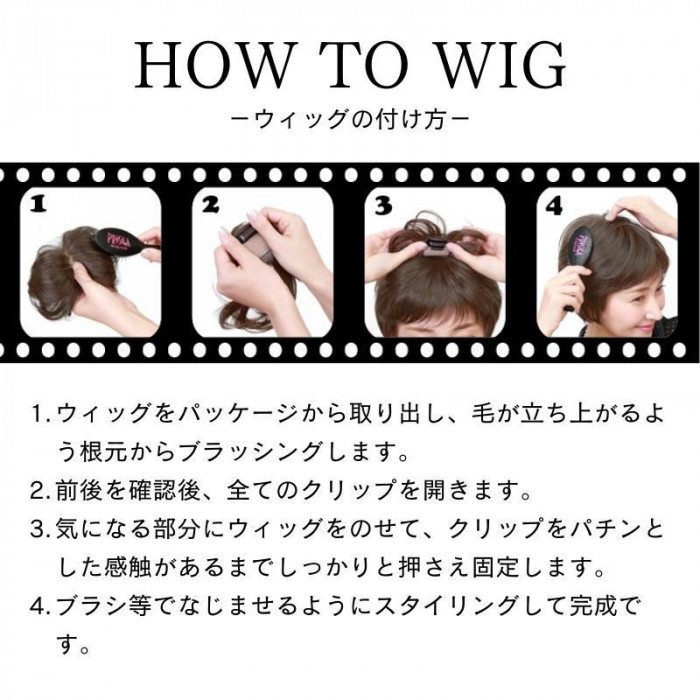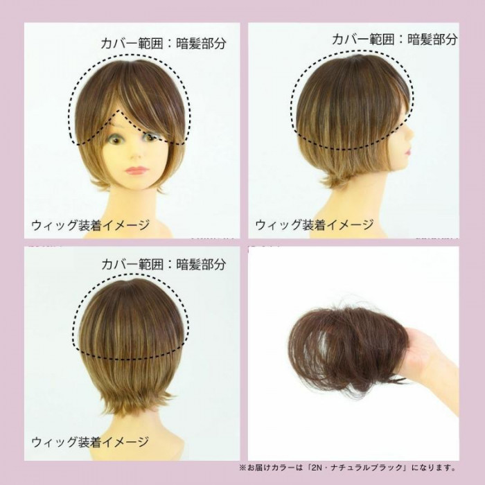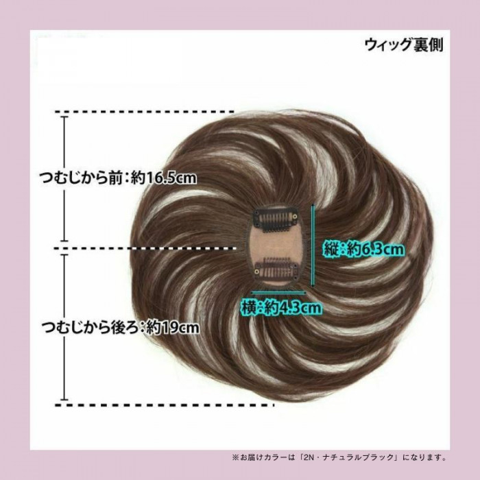 | 仕様 | つむじから前:約16.5cm つむじから後:約19cm スキン部分:縦:約6.3cm横:約4.3cm 人工スキン:有り クリップ2個付き(前側:黒、後側:茶) ウィッグのタイプ:耐熱白髪隠しウィッグ 適した毛質:カール・ストレート カバー範囲:つむじ部分 |