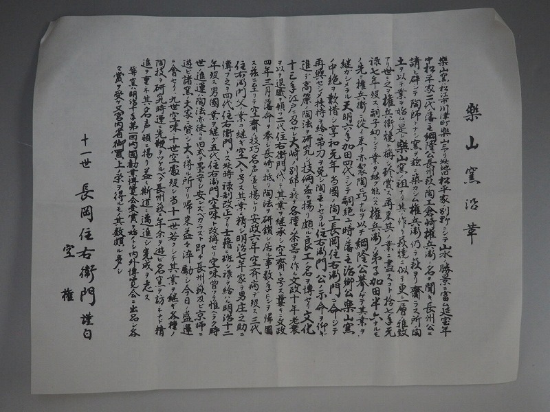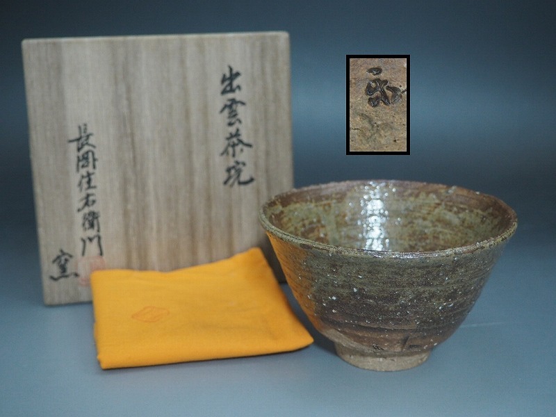 | A4080 十一世 長岡住右衛門 空権 楽山窯 出雲 茶碗 共布共箱付 完品 ☆ 茶道具 茶器 茶懐石 抹茶碗 陶器 在銘 陶印 窯印 美品 良品 無傷 | ||