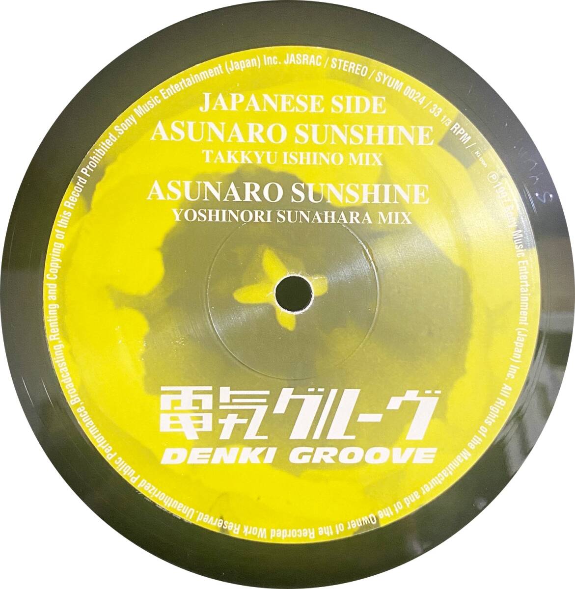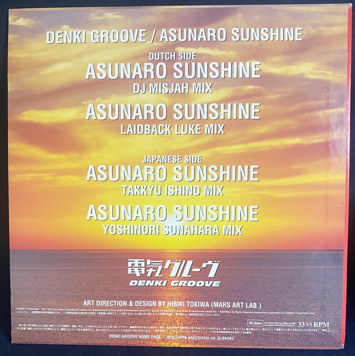 電気グルーヴ (Denki Groove)『あすなろサンシャイン(Asunaro Sunshine)』 1997年発売 Ki/oon 品番:SYUM 0024 ●レコード外袋、丸底透明内袋は新品に交換済。 ■コンディション ●ジャケット 若干のレコード跡(リングウェア)が有ります。 ●盤面 再生に影響の無い微小なスレが有ります。(EX++) 超音波洗浄済み(HUMMINGURU HG-01使用)、再生確認済み。 ■発送方法 送料:全国一律1080円
