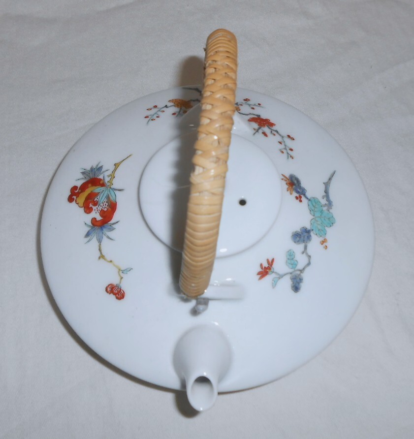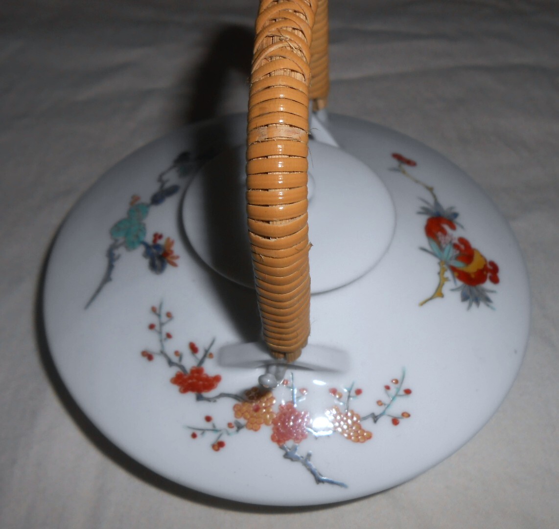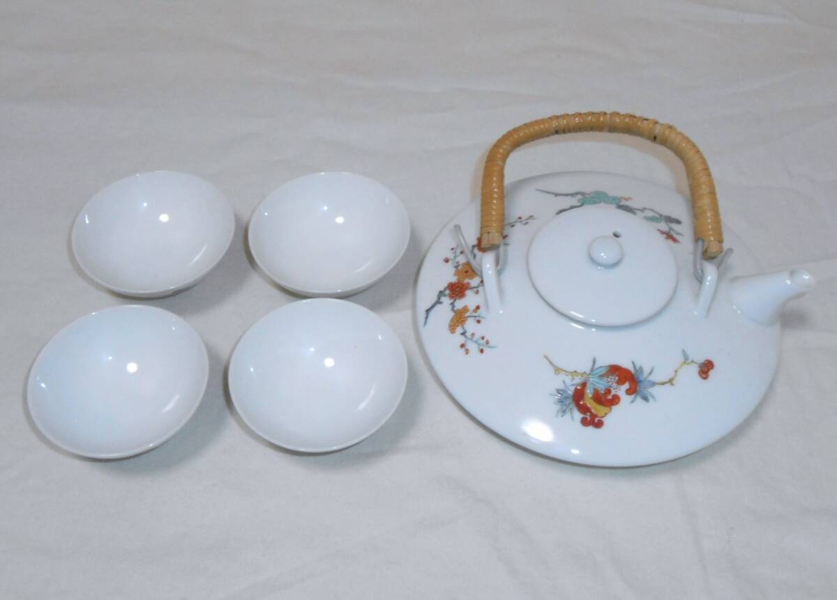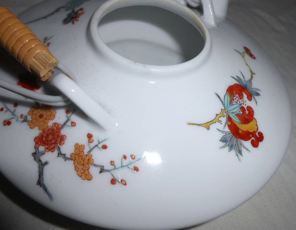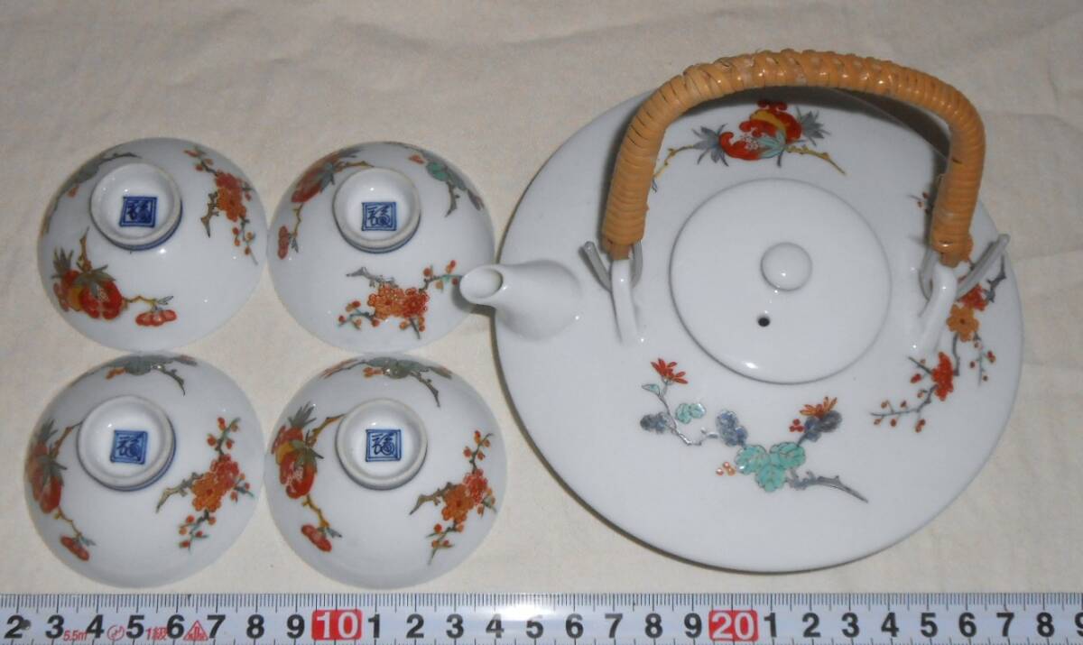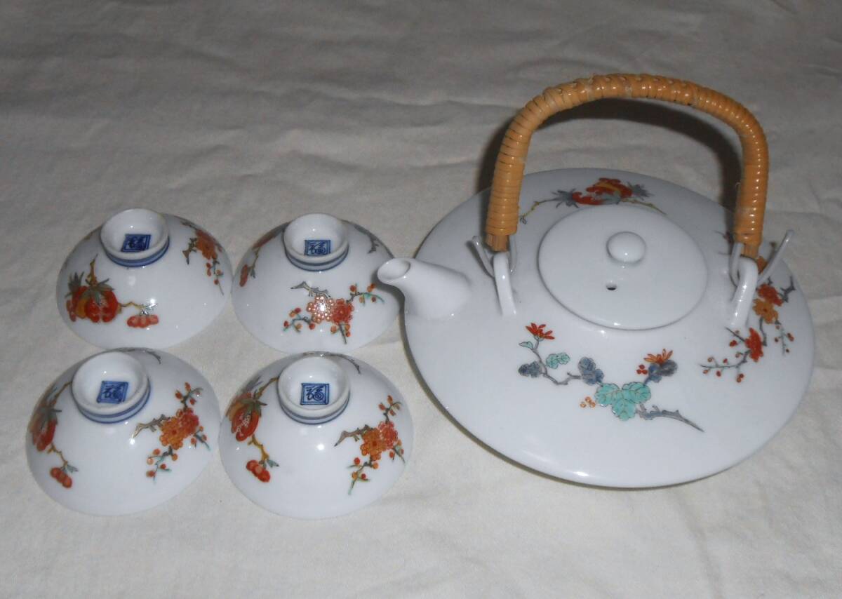 本体のみで箱等はありません。使用感なくきれいで良い状態ですが、わずかなスレや汚れ等はご容赦下さい。それぞれにいわゆる「渦福」銘が描かれ、少し前の柿右衛門の作かと思います。銚子上部の蓋との接合部に、釉薬がムラに掛かってちょっと茶色く焼けてしまったような変色部分があります。盃の口径約6,3×高さ約2,8cmです。