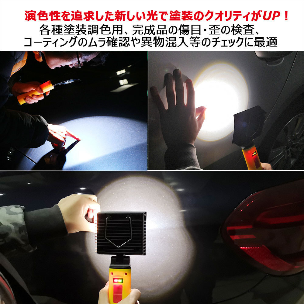 | ★オススメポイント★ 演色性を追求した新しい光、高演色マルチ作業用LEDライト。 手元を広く照らすので、エンジンルーム内や下回りの点検整備、車のタイヤ交換、 夜の緊急点検、電気のない車庫での作業など、様々なシーンで使用できます。 整備工場の他、スタンドや板金塗装業など多くの現場で使用できます。 塗装・調色用ライト ・塗装面の色調の確認用 ・磨き作業やキズ、仕上がり検査用 各種塗装調色用、完成品の傷目・歪の検査、コーティングのムラ確認や異物混入等のチェックに最適です。 整備作業用ワークライト ・自動車やトラック、重機などの車両整備・点検用 作業灯としても ・設備メンテナンス、工事現場、倉庫作業、トラック荷台作業用など 演色評価数値:CRI95 高演色Ra95以上のLEDチップ搭載、自然光により近い作業環境を実現し、 今までの光源では見えない色まで確認可能で、全ての色再現に優れた光源です。 色調2段階切り替え可能 ボタン一つでLOW→HIGHをカンタンに操作できます。 起動時の点灯モードはローモードで、眩しさを軽減し実用的! 点灯時間: LOW:約7時間以上 HIGH:約3時間以上 「鉄面に吸着+手持ち+吊り下げ」の3Way 鉄面に吸着 底部の超強力マグネットN50*4粒搭載し、鉄面に装着可能で、水平でも落ちない強度! 塗料棚や柱等に吸着し、自由に使用できますので、ハンズフリー作業を快適に! 手持ち コンパクトで軽い、片手でラクに持てます。 スティック型、また正面には滑り止め設計で、握りやすくて持ちやすい! 吊り下げ 折畳み埋め込み取っ手、本体にはまり込むタイプで、フラットで省スペース・安全性の向上にも。 角度調整 ヘッド部分は前後に約160°可動。照射方向を調整できます。 専用壁掛けホルダー付属 必要な場所に常に設置・保管でき紛失の心配も不要です。 |