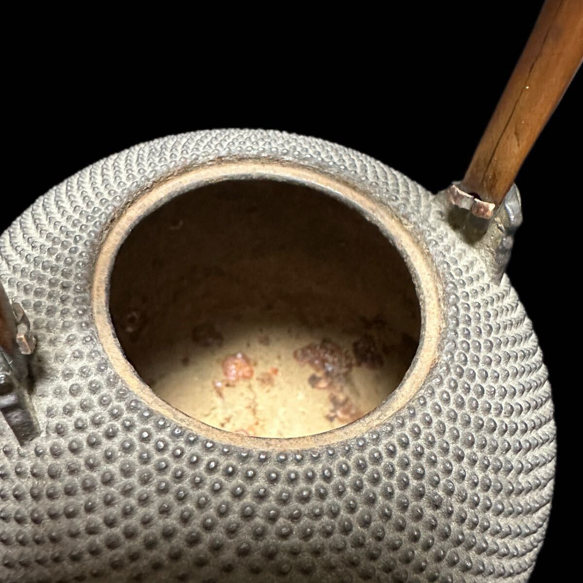 明治時代の光玉堂製鉄瓶。鬼霰文様の小型丸形、銀巻口、手彫り透かし銅提手付き。修復なし・漏れなしの極美品。茶道やコレクションに最適。希少価値の高い逸品です。蓋がない| 出价者 | 信用 | 价格 | 时间 |