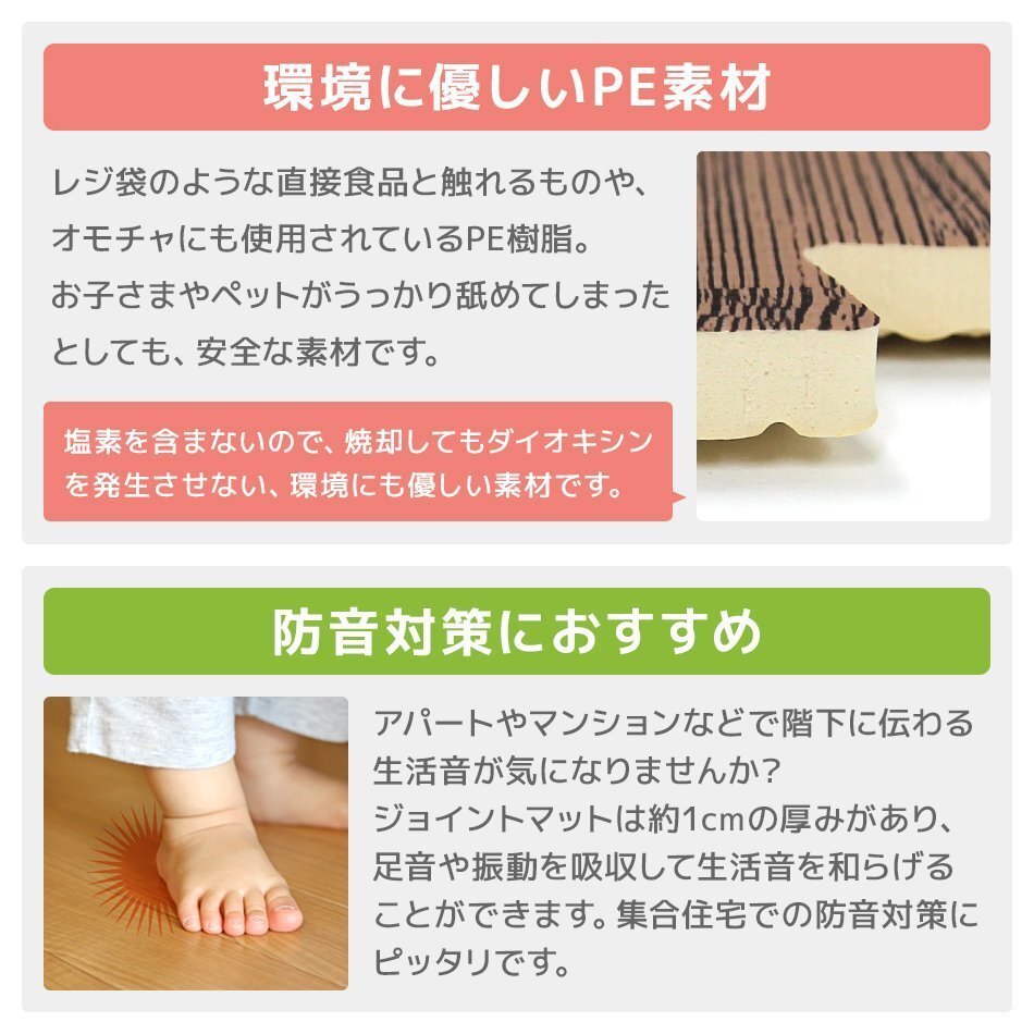 | 60cm 大判 ジョイントマットです。 カッターやはさみで簡単に切れるのでレイアウト自由自在! 足音をやわらげてくれるので、子供部屋やフローリングのお部屋に最適です! 適度なクッション性が転倒時に衝撃を和らげてくれます! 冬は床下からの冷気をカット! 夏は冷房による温度を効率よく保ちます。 汚れた部分は取り外して水洗いが出来てカンタンお手入れ♪ 嬉しい!サイドパーツ付き! 壁ぎわに敷いても、隙間なくキレイに。 掃除がラクラク!! 自然をイメージした木目デザイン! お部屋に落ち着いた雰囲気を与えてくれます! ■商品コード:FCA0560W ■商品仕様 カラー:アンティークホワイト サイズ(約):幅60×奥行60×厚み1.0cm(※1枚) 素材:PE素材 ■商品内容 ジョイントマット×32枚 サイドパーツ(角付きパーツ32本、角なしパーツ32本) ■注意事項 ※EVA樹脂の臭いが最初はある程度しますが、人体には影響ありません。 臭いによる返品はお受けできませんので、臭いの気になる方はその旨をご了承の上ご落札をお願いいたします。 ※重量物を載せますと、マットが凹み変形する恐れがあります。 ※入荷時期によって、厚みや幅に多少の誤差がある場合がございます。あらかじめご了承ください。 ※仕様・デザインは改良のため予告なく変更することがあります。 ※床材との温度差で製品が反る場合があります。 ■保障期間 7日間 ※商品到着後7日以内の初期不良・破損のみご対応させていただきます。 【もちろん新品未使用品です】 |