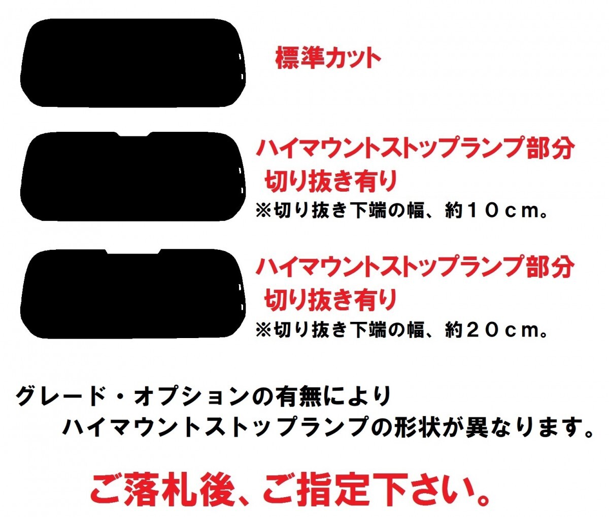 ご落札後、取引ナビよりご希望のフィルム・ハイマウントストップランプ部分の切り抜き 有り・無し 等をお聞きさせて頂きます。 | ||