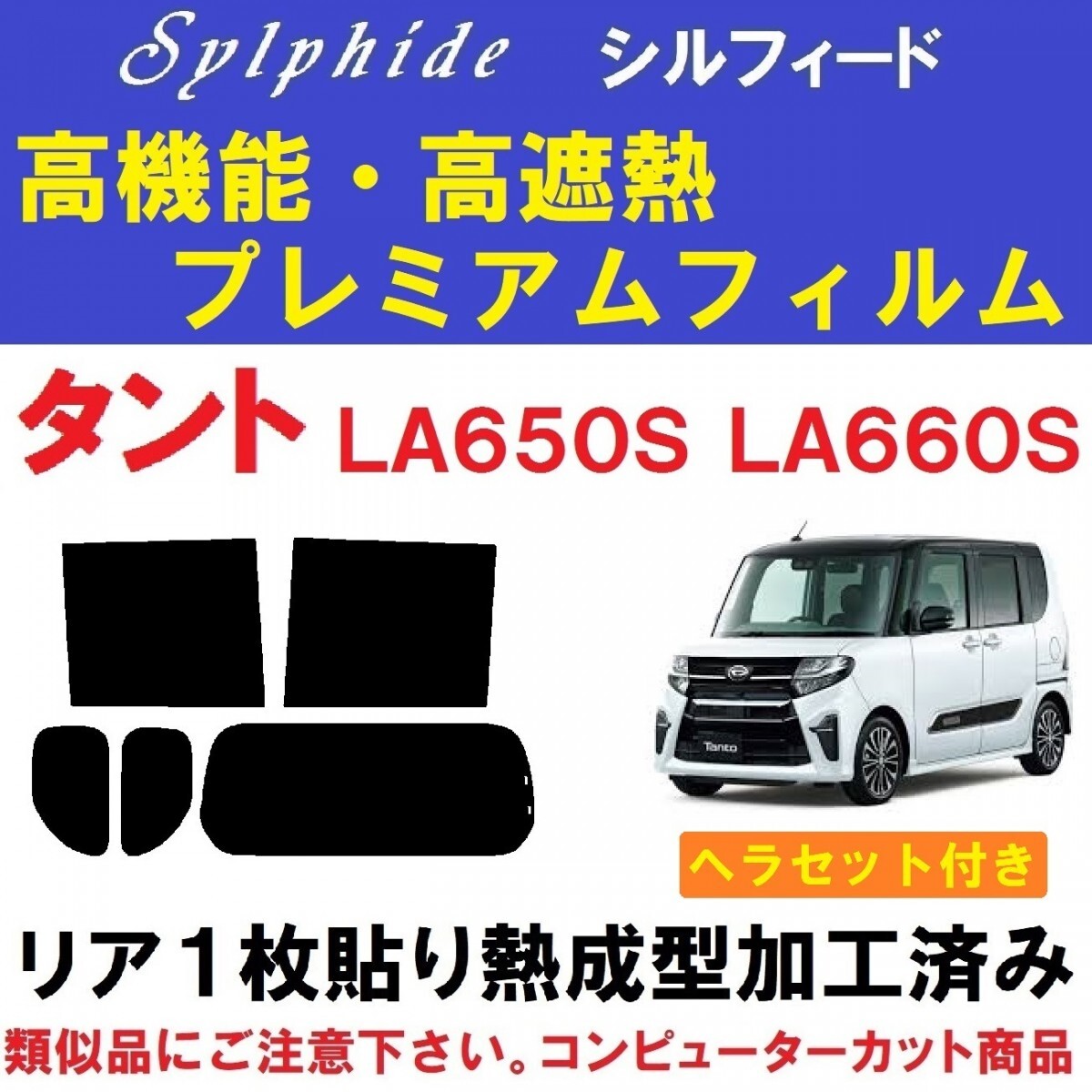 LA650S・LA660S タント タントカスタム用『高機能・高断熱フィルム シルフィード使用』リア1枚貼り成型加工済みフィルム リア5面セットです。(専用施工液付き) ・信頼の品質と実績で永い間業務用フィルムとして選ばれ続けているIKCS製品です。 ・業務用フィルムの中で最も信頼性の高い、ベストセラー商品です。 ・詳しくはアイケーシーエス株式会社HPをご覧ください。 ※シルフィードは、ベンツ等の高級輸入車を取り扱う 全国のヤナセでも指定フィルムとして使用されている信頼性の高い商品です。 令和1年7月~ LA650S LA660S タント・タントカスタムに適合します。 ハイマウントストップランプ部分の切り抜きも出来ます(画像3) ご落札後、ご指定下さい。 ※適合などご不明な点は、お気軽にご質問下さい。 ◇◆◇当商品には、画像2のヘラセットが付属します◇◆◇ ■滑りの良いシリコンタイプのゴムヘラ スムーズに水切り(清掃)・貼り付け後の水抜きが出来ます。 実際の業務でも色々な物を試しましたが、シンプルなこの形状・このメーカー・このグレードの物が1番使いやすいです。 柔軟性が有りガラス(フィルム)に密着するため、フィルム折れも防げます。 ■使いやすい厚みとコシの有るプラヘラ 形状は似ていても各メーカーにより硬さ・厚みなど色々と有ります。 慣れていない方でも扱い易いように少々柔らか目の物になります。 ヘラ先にはフッ素樹脂加工のクロスを貼って有りますので、滑りが良くキズを防止します。 ■ワイプオール(不織布ワイパー) 布同様の丈夫さと紙の持つ吸水性を発揮。糸くずの発生が無く均一素材のため異物混入の心配が有りません。 施工前のガラスクリーニング~施工時にフィルムが触れる可能性の有るガラスの周りのゴム部品の拭き取り清掃~吸水等に大変便利です。 全て実際の業務に使用している物で、その中から使いやすい物を選んでいます。 ヘラセットがご不用の場合、フィルムのみの商品も有ります。こちら ◇◆◇精密コンピューターカット◇◆◇ 貼りやすさを最優先に各部のサイズ・形状など微調整し、改良を重ねた独自のデータを製作。 高精度な最新・大型カッティングプロッターによるカットで正確で滑らかなカットラインを再現しています。 施工業者だからわかる、貼りやすいサイズ・形状に仕上げています。 ◇◆◇リア1枚貼り成型加工済み◇◆◇ リアガラスの湾曲に合わせて熱成型加工して有りますので、平面に貼るのと同様にたるみが出ず1枚貼り出来ます。 ※最適な状態に成型加工して有りますので、ヒートガン(ドライヤー)等は不要です。 ◇◆◇専用施工液付属◇◆◇ 軽視されがちな施工液ですが、貼りやすさに大きく関わる部分になります。中性洗剤などで代用せず、必ず付属の専用施工液をご使用下さい。 濃度については車種・季節などにより変わりますので、個別にお知らせ致します。 ☆高機能・高断熱フィルム シルフィード☆ シルフィードは、太陽エネルギーの中の赤外線を大幅にカットすることで車内の温度上昇を抑え、より快適な車内環境を実現する高性能断熱カーフィルムです。 スモークの濃さとは関係なく赤外線のカット率がほぼ一定なので、お好みの濃さのフィルムで優れた断熱効果を実感できます。 赤外線吸収率の高い金属酸化物ITO(酸化インジウムスズ)からなるセラミックを採用する事で高い遮熱効果を実現しているので、遮熱効果を求める為に真っ黒やミラーと言ったフィルムを選択する必要はありません。 透明性も高く、ハードコートでキズにも強いシルフィードは長期間にわたって持続します。 「Sylphide」シルフィードの信頼性は、ベンツなどの高級外車を取り扱う全国のヤナセで指定フィルムとしても取り扱いをされています。 ☆車内の温度を上げる要因・赤外線を大幅カット☆ 赤外線は、目に見える光ではありません。車窓から入り込む太陽光の中に含まれる赤外線は車内の温度を上げる大きな原因となっています。 光の大半を遮断する様な真っ黒なフィルムや光を反射するミラー仕様のフィルムを使わなくても、シルフィードは赤外線を90%以上も遮断して車内の温度上昇を抑えます。お好みの濃さ、お好みの色のフィルムで快適な車内環境を実現し、クリアな視界を確保できる高機能フィルムです。 ■フィルムの種類■ 可視光線透過率 3% SC-7003 可視光線透過率 7% SC-7008 可視光線透過率13% SC-7015 可視光線透過率20% SC-7020 可視光線透過率30% SC-7030 可視光線透過率46% SC-7045 ■全商品、キズに強いハードコート・紫外線(UV)カット率99% 赤外線(IR)カット率92%です。 ※可視光線透過率が低くなるほどフィルムの色は濃くなります。 サイドとリアで濃さを替えたり等、可能です。 部分的にフィルムが必要になった場合、単品販売も承ります。 他にもタント用フィルム、各種出品中です。こちらもご覧ください。 下記のOEM車両にも適合します。 ・スバル・シフォン(LA650F/LA660F) ご不明な点など有りましたら、お気軽にご質問下さい。 | ||