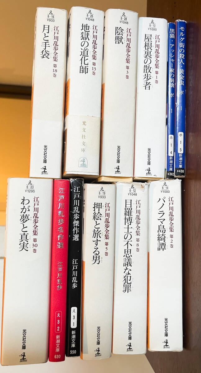 日本推理小説の巨匠、江戸川乱歩の作品を集めた文庫本セットです。 光文社文庫の「江戸川乱歩全集」を中心に、代表作を多数収録しています。 セット内容(全11冊) 【光文社文庫 江戸川乱歩全集】 屋根裏の散歩者(第1巻) 陰獣(第3巻) 押絵と旅する男(第5巻) 目羅博士の不思議な犯罪(第8巻) パノラマ島綺譚(第9巻) 地獄の道化師(第13巻) 月と手袋(第18巻) わが夢と真実(第30巻) 【新潮文庫】 9. 江戸川乱歩傑作選、10.江戸川乱歩名作選 【光文社文庫 エドガー・アラン・ポー】 11. モルグ街の殺人・黄金虫 12. 黒猫・アッシャー家の崩壊 出版社: 光文社・新潮社