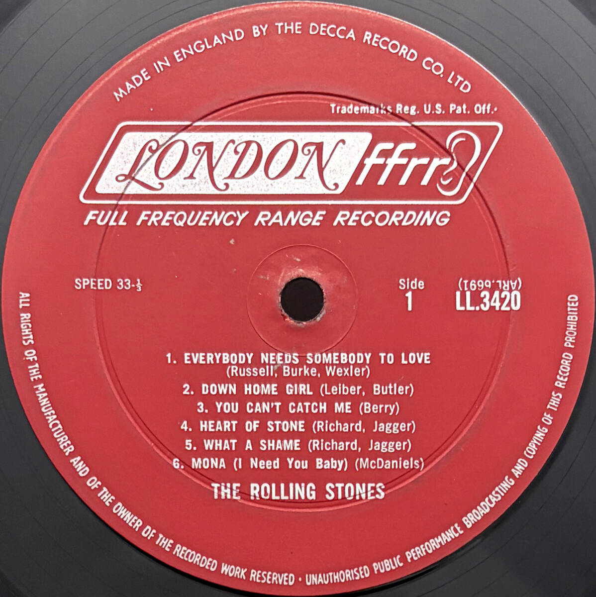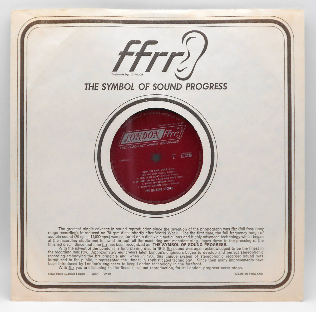 ローリング・ストーンズが1965年に発売した米国での3枚目となる独自編集盤。レアな最初期英国プレスの米国盤です。 英国で発売された2ndアルバム「The Rolling Stones No. 2」からの7曲に加え、シングル『Heart of Stone』『Little Red Rooster』、そして本作で初めて発表された『Oh Baby』『Surprise, Surprise』の2曲の未発表曲等、全12曲を収録。 ローリング・ストーンズの米国盤は初期の4枚まで、ジャケットは米国製造ですが、レコード盤のみラベルに「MADE IN ENGLAND BY THE DECCA RECORD CO LTD.」「LONDON FFrr」と表記された英国プレスの最初期プレス盤が極少数のみ存在します。音の方も米国プレス盤とは異なり、音圧の凄い迫力のサウンドです。カンパニースリーブ付。 デッドワックス刻印はA面:XARL-6691-1K 1 1/B面:XARL-6692-1K 1 1になります。 |