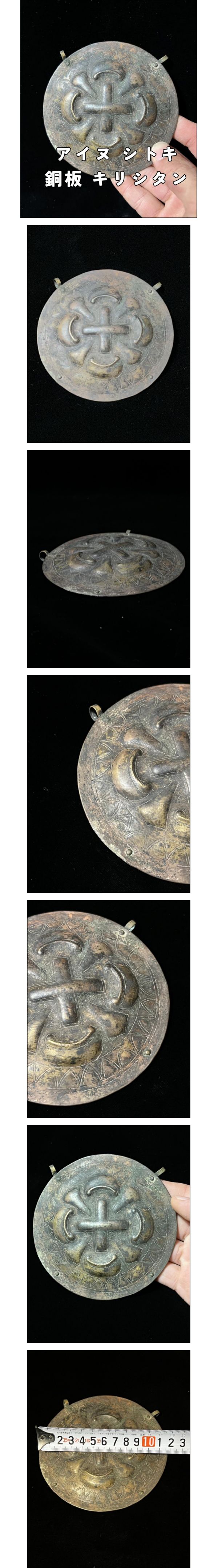 | 商品説明 | 古いシトキ、打ち出し丸銅版の出品となります。 中央に十字架が施されている逸品です。 おそらくキリシタンアイヌの品かと思われます。 上部2か所に玉を繋ぎ留める穴、環がついています。 箱等は付属いたしません。 特筆すべき大きな疵はありません。 画像にてよくご確認下さい。 サイズ 直径 約12cm 【画像無断転載、転売について】 弊社は海外へ直接出品しています。 弊社出品物を海外サイトへ無断画像盗用にて販売されている事を 発見した場合、即座にVero通報及び法的訴訟の対応及び即時出品物を購入、 当出品を取り下げいたします。 無断転載、転売は絶対に許しません。 ・品物に年式が記されている物以外の制作年月はあくまで当方の主観、または入手時に前所有者より聞き及んだ年代です。参考値としてご理解下さい。 ・1円、1000円などの低額スタートにて想定より大幅に金額が到達しない場合や また記載項目と実際の品に乖離があった場合を出品取り下げる場合がございます。 入札後の取り下げは出品者の権利として上で認められております。 当出品は営利で運営しており不用品等の譲渡ではない為、ご理解の程お願い致します。 その場合、定額にて再出品させて頂きますが、初回の1000円スタートでの落札価格が最も安価に入手できる機会となる為、初回の定額スタートにて入札をお勧めいたします。 |