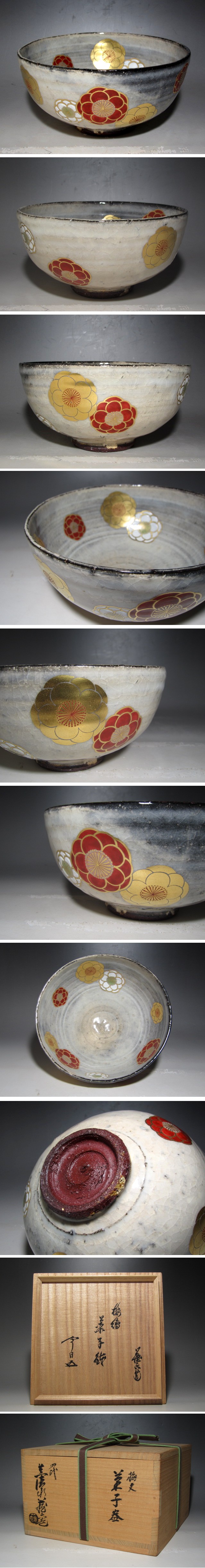 真清水蔵六作の梅絵菓子鉢です。 味わい深い姿の、趣ある作品です。 箱蓋裏に裏千家十五世鵬雲斎の花押があります。 サイズ 直径18cm/高さ9.5cm(多少の誤差はお許しください) 状態 一見して疵やヒビ・直しは見られません。 骨董品という事をご勘案頂き、時代経過のスレや、小さな傷がある場合があるかもしれませんのでご承知置きください。 | |||