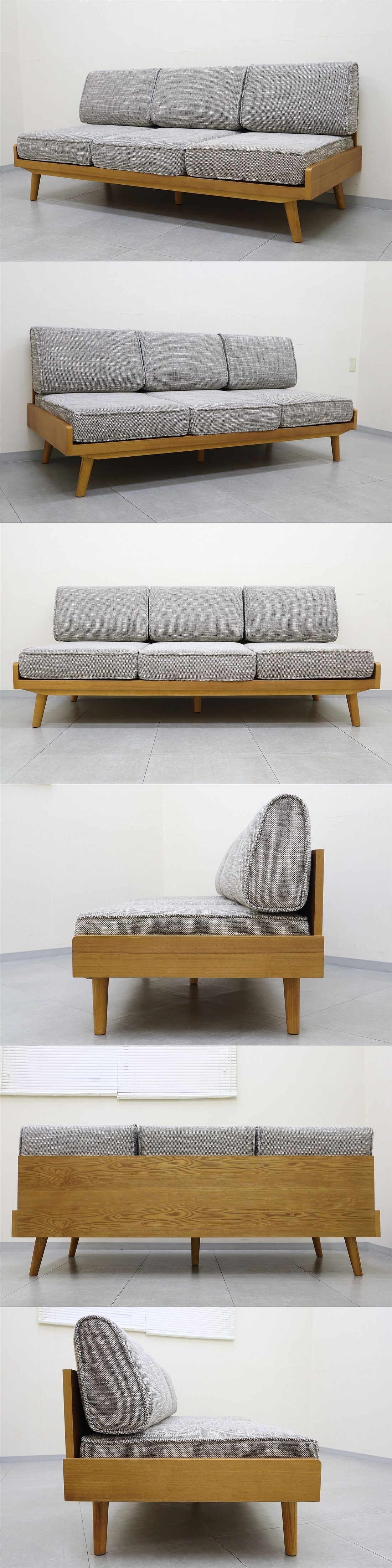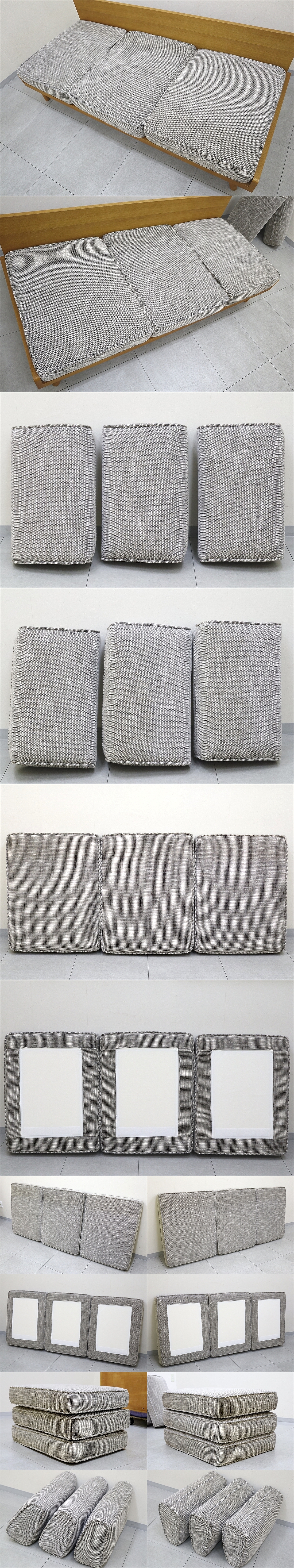 背座カバー・クッションの置き箇所や背もたれ面など、気になる箇所では御座いませんが薄いやけが少し御座います。また座面一枚は奥と手前を逆に使用されておりましたのでご了承下さい。
