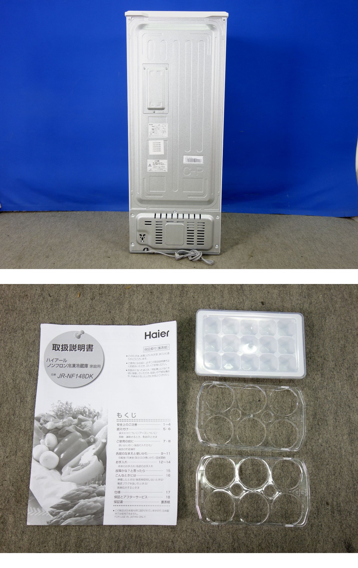 こちらの商品は、本州のみ「送料無料」にて発送致します。 ドライバーさん1人による玄関先卸しとなります。 ※状況により、荷下ろし時にお手伝いが必要な場合がございます。 千葉県・東京都・埼玉県・茨城県・神奈川県・栃木県・群馬県(一部地域除く)は 当方、自社便にて直接のお届けとなります。 ※北海道・四国・九州・沖縄・離島は、 ヤマト家財便元払い「落札者様負担」Cランクでの発送です。 Haier ハイアール 2ドア冷凍冷蔵庫 JR-NF148DK-W 右開き 2023年製 カラー:ホワイト トップテーブル(天板):耐熱(100℃) 定額内容積:148L 冷蔵室/94L 冷凍室/54L 外形寸法:(約)幅502×奥行598×高さ1275mm 質量:(約)42.0kg 動作確認・除菌クリーニング済みです。 庫内(棚・ポケット)に、割れ・欠けなどのないきれいな状態だと思います。 USED品ですので、使用感・スレ・小傷等は、ございます。 商品状態は、画像にてご判断ください。 画像は撮影時及びPC環境設定により、異なる場合がございます。予めご了承ください。 画像を多数掲載しておりますので、PCにてご確認・ご参照くださいますようお願い致します。 携帯電話・スマートフォンでは、ご覧いただけない場合がございます。