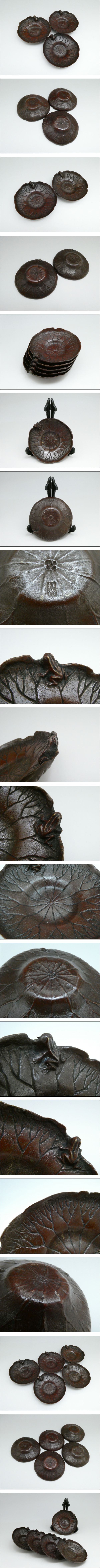 | ★商品★ ・蓮葉形蛙文茶托 (五客揃) ★銘★ ・琢斎 ★寸法★ ・直径 (約)10cm ・高さ (約)2.5cm ★重量★ ・(約)807g ※五客すべてを合わせた重量 ★材質★ ・銅製 ★状態★ ・経年による多少の傷、汚れ、変色が見られます。 ※備考※ 商品状態に関しては、あくまでも当方の見立てとなります。 程度には個人差がございますので、商品画像を良くご覧になられた上でのご入札お待ちしております。 画像の台座は付属しません。 |