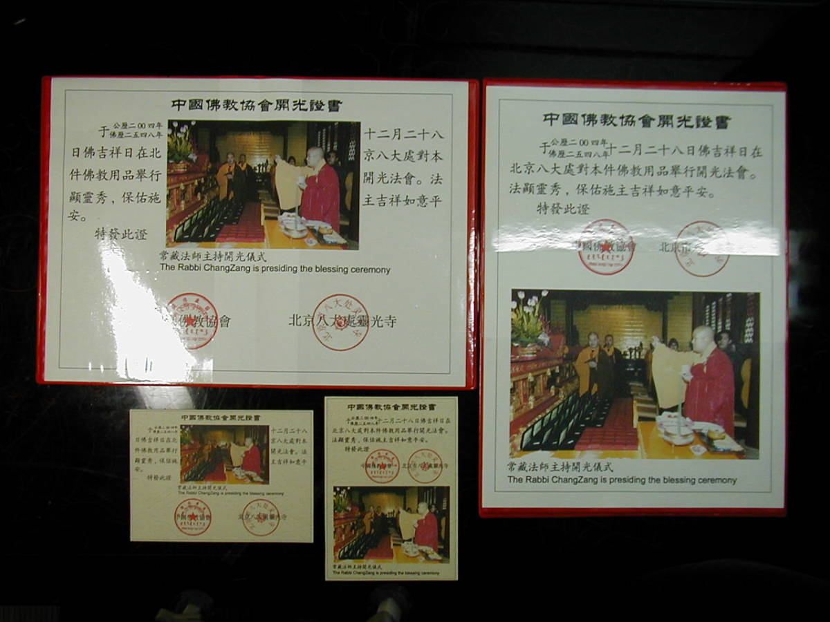 お付けする開光証書は、中国佛教協会と北京八大処霊光寺により発行されたものです。写真右側の大きい開光証書は、正式の原本です。(1,600件の開光品に対してたった一つの証書が発行されたのみです。小さい正式開光証書は、中国佛教協会と北京八大処霊光寺により発行された本品のための正式開光証書です。)