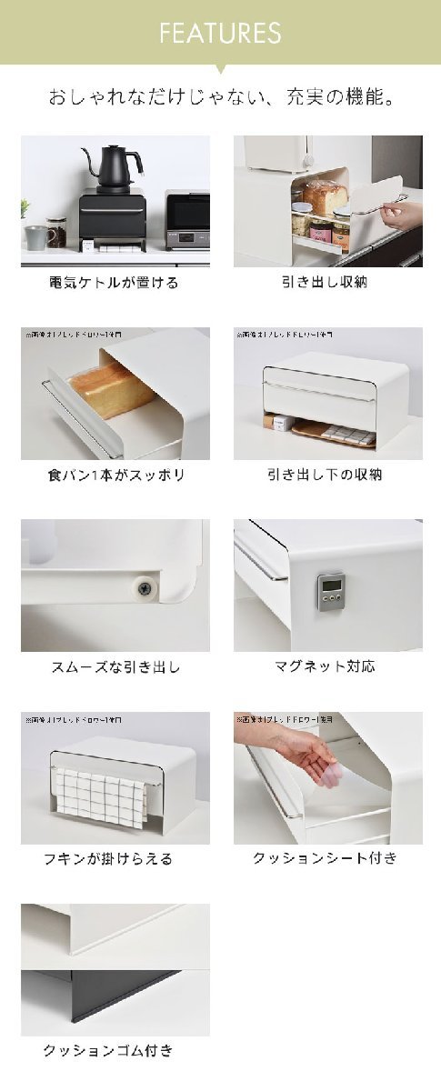 | キッチン周りをスッキリ収納! 上面にはポップアップトースターや電気ケトルが載せられるので今まで置いていたスペースを有効活用できます。 食パンやコーヒー瓶やお菓子など、いろんなものをスッキリ収納できます。 引き出しはローラー付きのレールでスムーズに引き出せ、パッと中身が見渡せて奥の物も取りやすいです。 引き出しを閉めるときは、奥に音を軽減するフェルト製クッションが貼ってあるので、金属のぶつかる音を軽減し、静かに引き出しを閉めることができます。 トレイやラップなどは引き出し下のスペースに収納でき、ステンレス製の取っ手にはフキンが掛けられます。 本体はマグネット対応なのでキッチンタイマーやマグネット式のフックなどつけておいても便利。 引き出し底板の傷付きを防ぎ、中身の滑り止めにもなるクッションシートと、設置場所を保護するクッションゴム付き。 キッチンだけではなく、お部屋や玄関などにも置いて小物などを入れておけます。 爽やかな清潔感のあるピュアホワイトはスッキリとした清々しい空間を演出します。 |