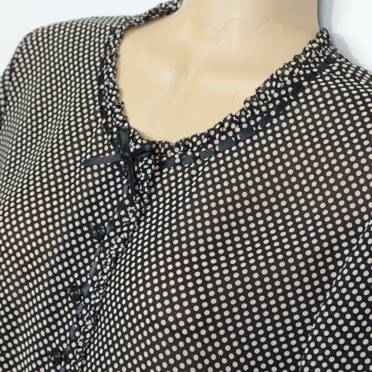 | 商品説明 | 【実寸約】 ブラウス 肩幅39 袖丈60 バスト94 着丈56 スカート ウエスト 64 丈85(cm) 【サイズ表記】 S 【素材】 ブラウス ポリエステル100 スカート ポリエステル65 レーヨン35 別布 ポリエステル100 【状態】 使用感少なめの美品 【デザイン】 黒系 軽やかなシフォン調の薄手のブラウスと、同素材を裾で切り替えたスカートの2点セットアップです。 ブラウスはドット柄にサテンリボンのアクセントをつけた大人可愛いお品です。 スカートは切り替えデザインにフリルをほどこし、すっきりとした女性らしいシルエットです。 セットアップではもちろん、別々にも着回し力抜群のデザインなので、大人フェミニンコーデにそれぞれ重宝する優秀アイテムです。 スカート裏地あり、後ろファスナー仕様。 希少なヴィンテージ品です。 |