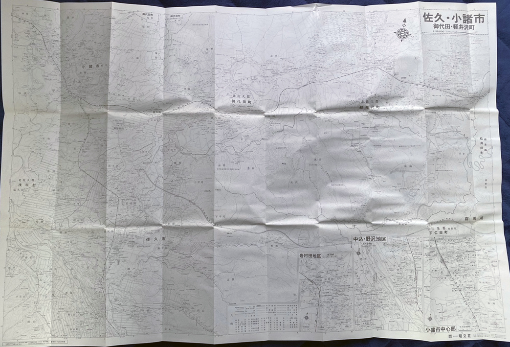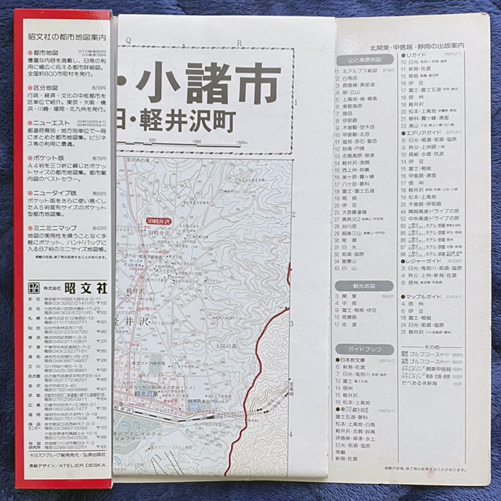 エリアマップ「佐久・小諸市 御代田・軽井沢町」昭文社(平成4年)/1992年発行 昭文社 定価620円 カバーケース約215×105mm 表裏の折り畳み地図/本図1:25,000・中心部詳細図1:12,000・詳細地番・バス路線・裏面記入用白図/カバーケースにスレ・シワ・黄ばみなどあります。地図はわずかに折れ跡などありますが概ね良好です/33年前の古い地図なので神経質な方には向きません。ノークレーム・ノーリターンでお願いします/送料はゆうパケットポスト230円(追跡有・郵便受届・補償無)。