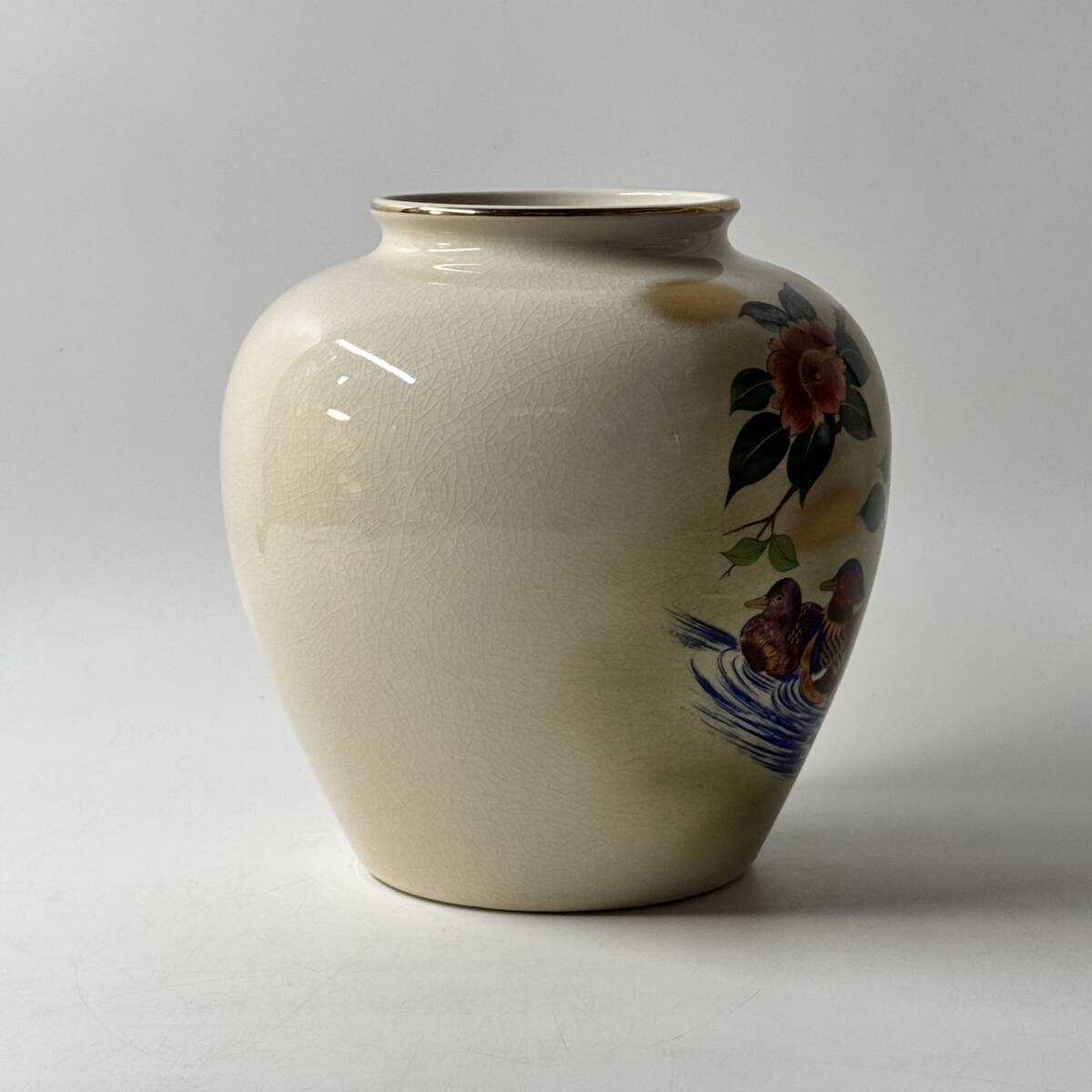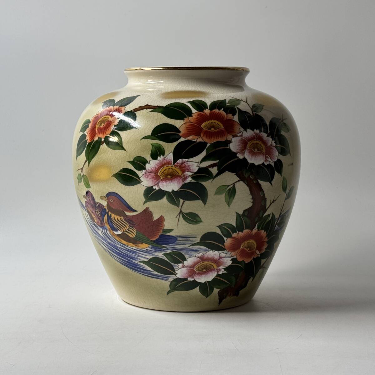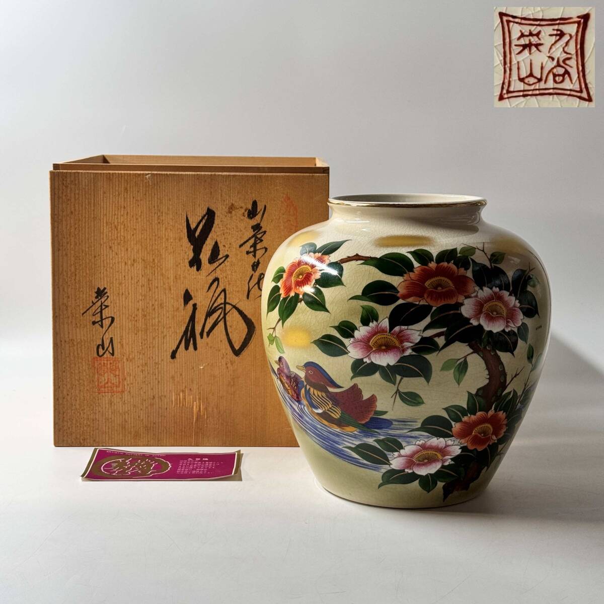 九谷焼 栄山 金彩色絵 貫入 鴛鴦 牡丹 花鳥図 花瓶 花器 花入 花生 華道具 茶道具 共箱 栞 経年保管品 現状品の出品です。
