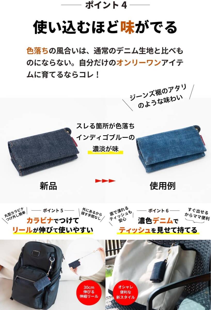 ・おしゃれ便利な新スタイル 濃色デニムでティッシュを見せて持てる。