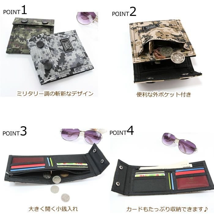 | 商品説明 | カジュアルでカッコイイアーミーデザインの財布が新登場! ボタン付きだからベルトにひっかけてもカッコイイ |