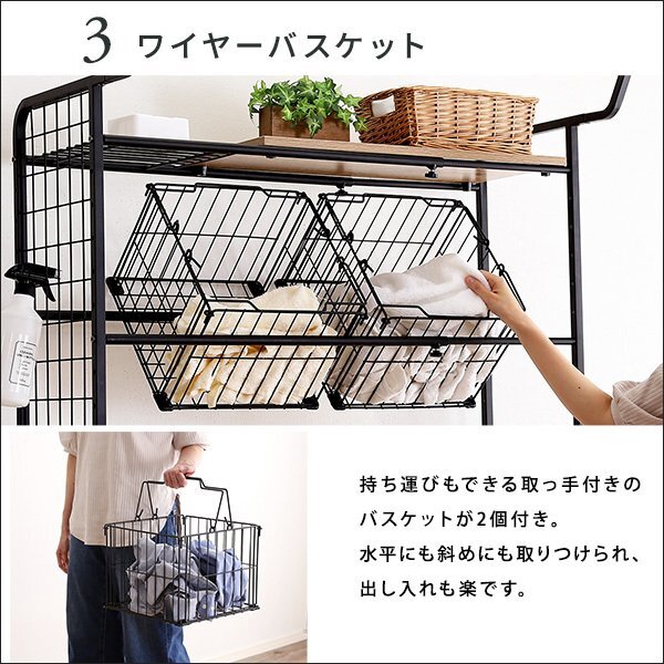 | 【ポイント】 幅は65cmから90cmまで無段階に調整できるので大型洗濯機にも対応できます。 洗濯物を一時的にかける時に便利なハンガーバーが付いています。 棚板裏面には、ズレ落ち防止ストッパーが4つ付いているので、万が一の落下を防ぎます。 持ち運びできる取っ手付きのバスケットが2個付きです。 棚とバスケットの高さは12段階調整可能です。 |