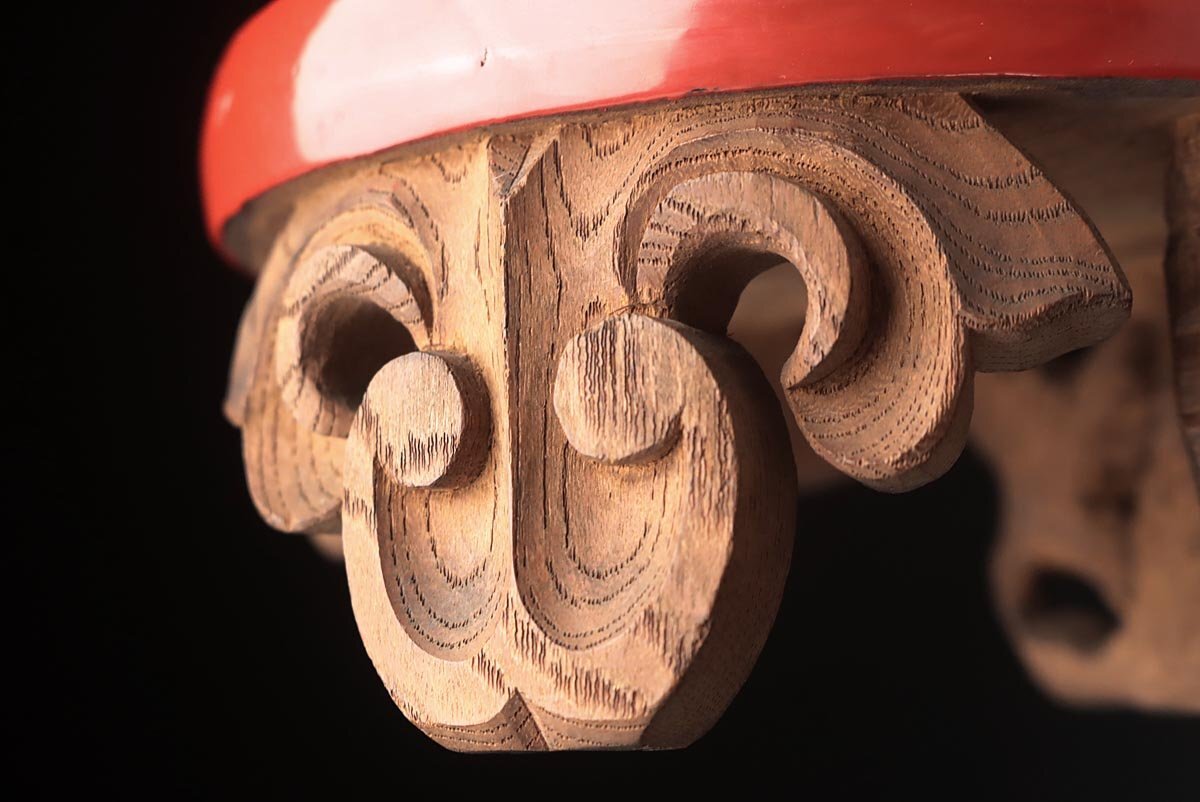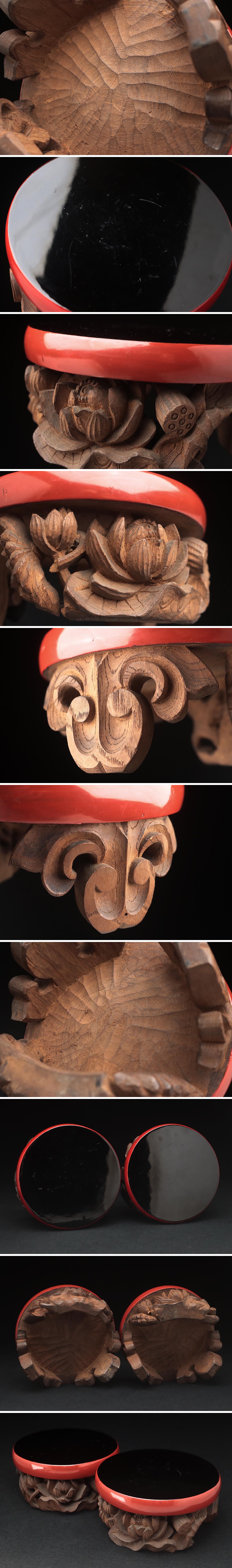 | ◆ 時代 細密彫 黒面朱 一刀彫 木彫 蓮華彫 三足 丸形 香炉台 2点・底座・リン台・仏台・佛像台 仏教古美術 ◆
