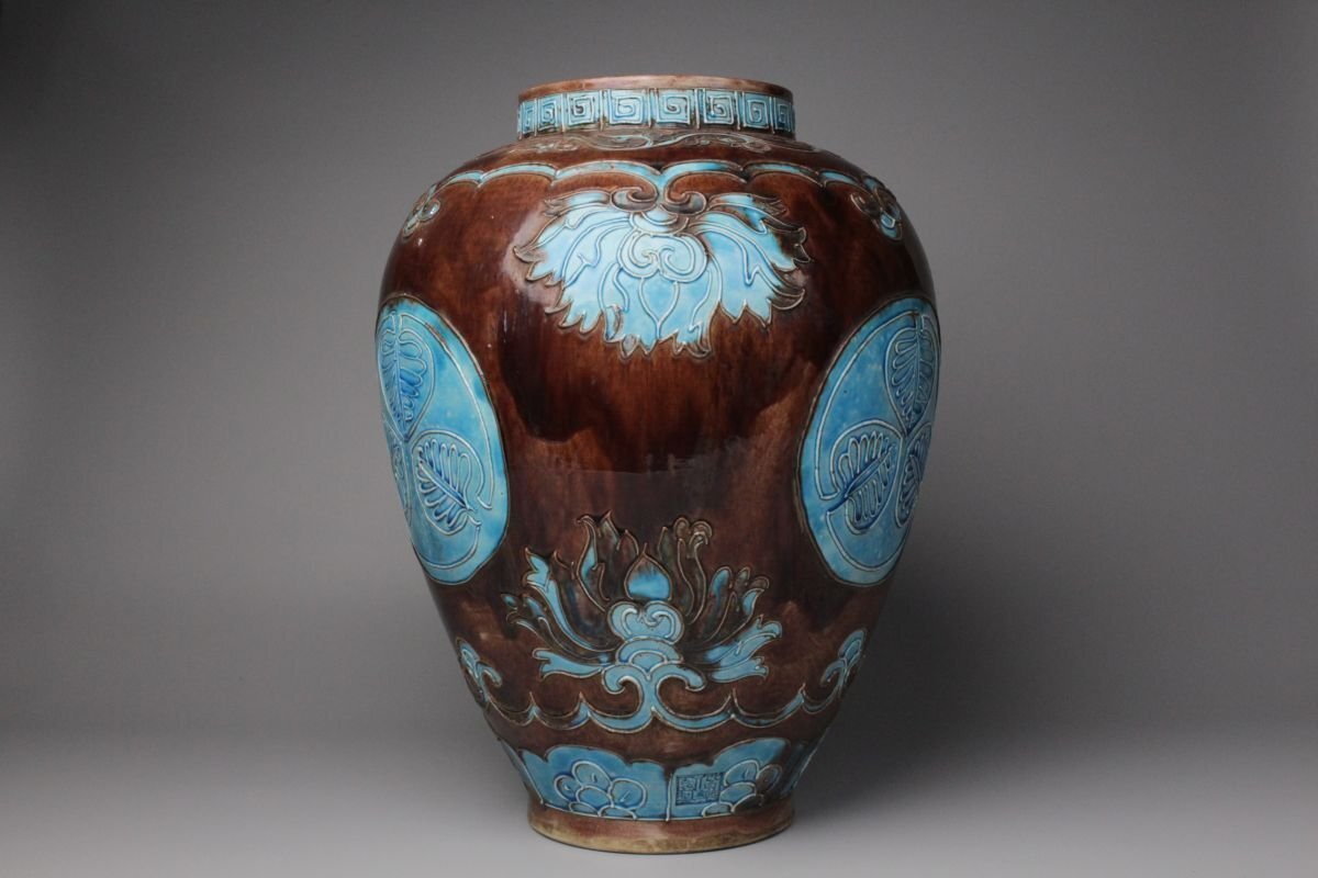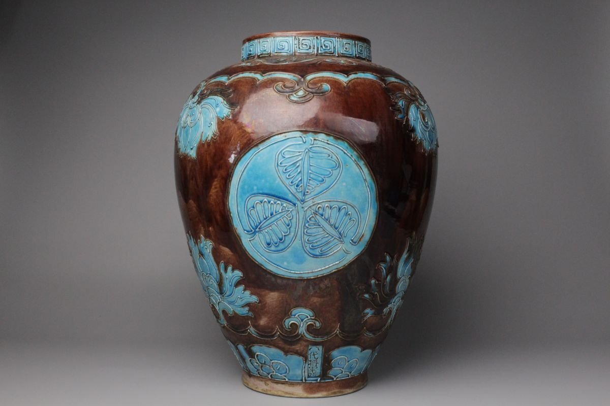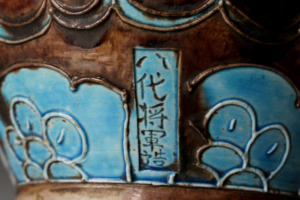 [.EE]25.09 25090905 A* * * 商品詳細 * * * ここでしか出逢うことのできない唯一の美をご紹介させて頂きます。 偕楽園焼 紫交趾壽字丸文花瓶のご紹介です。 青と紫の二彩が鮮やかに調和し、ひときわ目を惹く美しさを湛えた花瓶。 華やぎの中にも格調があり、寿字丸文の意匠が、縁起の良さと雅趣を同時に感じさせます。 偕楽園焼は、文政年間(1818~1830)、紀州藩十代藩主・徳川治宝が西浜御殿内の偕楽園において、 京都の陶工や名工・永楽保全らを招いて焼かせたことに端を発すると伝わる、由緒ある焼物です。 その歴史とともに、洗練された色彩美と高雅な意匠が響き合う逸品。 この機会に、歴史と美が融合した一品をぜひお手元にてお楽しみください。 ■サイズ/横28㎝×高35㎝ ■状態/ 経年によるスレ、小傷、汚れがございます。 ※写真にてご確認、ご了承の上ご入札下さい。