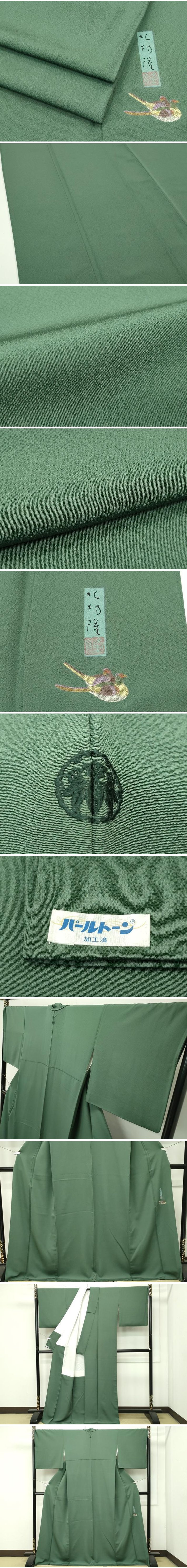 | 【正絹・一つ紋】 状態は特に目立ったシミ汚れなどもなく大変良い状態です。 〜北村隆 陶歴〜 1946年 石川県に生まれる 1973年 第6回 日展初入選(以後27回入選) 第15回 日本現代工芸展初入選(以後連続入選) 1988年 シンガポール芸術祭参加国立博物館特別出品 歌手マイケルジャクソン日本講演記念での似顔絵陶額製作 1997年 寺井町九谷焼資料館にて 「陶芸の遣道28年 金彩の美 北村隆の世界展」開催する。 通商産業大臣より伝統工芸士に認定される。 2002年 現代美術展 審査員 京都大徳寺・芳春院と加賀百万石伝統工芸作家展をする。 持統天皇一千三百年玉忌奈良薬師寺大講堂復興記念「北前船大皿」奉納 京都大徳寺・芳春院木像開眼法要鵬雲齋家元献茶「九谷焼三貝足」奉納 小松市お旅まつり八日市子供歌舞伎曳山天井画を奈良薬師寺松久保秀胤管主と「四神の図」制作する。 2012年 第39回 国際公募美術家連展 外務大臣賞受賞 北前船九谷焼飾り屏風 石川県ブランドとして認定 大変上質な極上の逸品になります。 お安く出品致しますので、是非この機会にいかがでしょうか? ※タイトルに老竹色と記載しておりますが、個人の見解も様々かと思います。 実際は和色大辞典の老竹色をやや暗くしたお色に近いかと思います。
