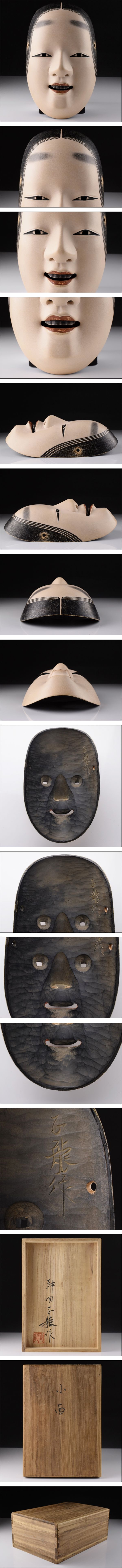 | 品 名:能面師 沖田正龍 作 木彫 能面 【小面】共箱 神楽面 狂言面 寸 法:縦 21.3㎝ 横 13.4㎝ 総重量:128g 状 態:目立った傷など無く良品でございます。 | |||