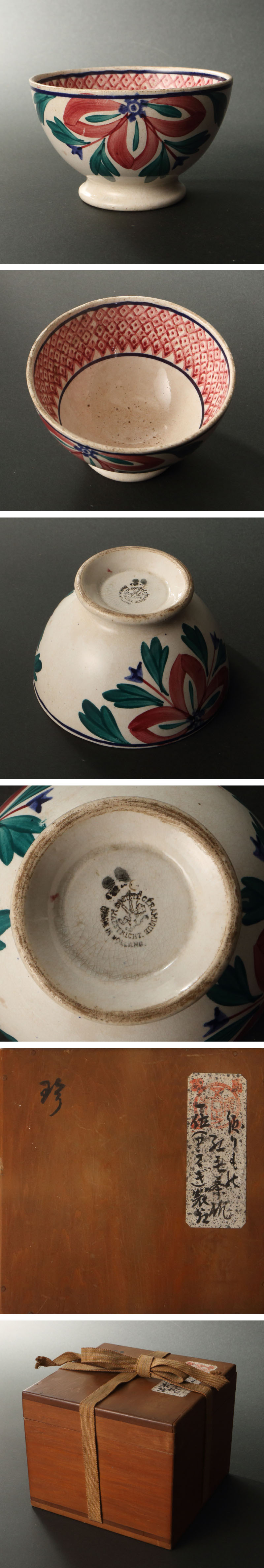 阿蘭陀色絵の花卉文茶碗です。 オランダ・マーストリヒトのソシエテ・セラミック窯が製作したカンペール焼写のカフェオレボウルを、更に抹茶碗に見立てたものです。ソシエテ・セラミック窯はプリントウェア(藍阿蘭陀)の生産でペトルス・レグー社と熾烈な競争を行ったことで知られます。 カンペール焼はフランス・ブルターニュ地方で生まれたファイアンス焼の流れを汲む色絵陶器で、17世紀後半、ルイ14世が戦費調達のため銀食器製造の製造を禁止し、カンペールにマルセイユから陶工ジャン=バティスト・ブケ(ブスケ)を招き、王立陶器工房を設立したことに端を発します。 丁度同時期に刺激の強いコーヒーをおいしく飲むため、カフェオレが考案されたことも相俟って、アンペール焼の「ブルトンボウル」はカフェオレボウルの王様と呼ばれるまで成長します。職人の丁寧な絵付が煌めくボウルはセザンヌやゴーギャン、ピカソにもこよなく愛され、ソシエテ・セラミック窯もまたカンペール焼の写を主力製品としました。 一碗から海の向こうの「喫茶」の歴史が見える、面白い逸品です。 ◆ソシエテ・セラミック窯 19世紀後半~20世紀前半のオランダ・マーストリヒトの陶器工房。1859年設立。プリントウェアを中心に人気を博し、ペトルス・レグー(スフィンクス窯)の有力な競合相手であった。1958年、スフィンクス窯と合併。 ◆カンペール焼 フランス・ブルターニュ地方の陶器。総窯元であるアンリオ・カンペール社はルイ14世の王立陶器工房であり、「ブルトンボウル」と呼ばれるカフェオレボウルが人気を博した。現在でも職人による手描きの絵付けが行われる。 付属:識箱が付属します。 寸法:高さ6.5cm、幅11cm(最大幅。若干の誤差はご了承下さい) 状態:経年感、釉ハゲがございます。 |