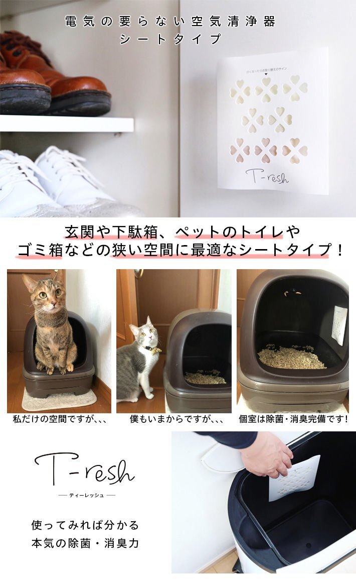 | 【 商品説説明 】 ★T-resh (シートタイプ)は、特殊なフィルターにより安定的に二酸化塩素を発生させ、空気中の殺菌やウイルスの除去、腐敗臭・汚物臭・タバコ臭・ペット臭・汗臭・加齢臭などの生活臭を消臭します。 ★シートタイプは薄く、貼り付けるタイプなので場所も取りません。 ペット・ゴミ箱・社内・お手洗い・洗面所・靴箱...etc におすすめです。 (45日有効) ★手の届かない壁に貼り付けられますので、介護施設や保育園・幼稚園・こども園など誤飲の可能性のある場所でも安心してご使用いただけます。