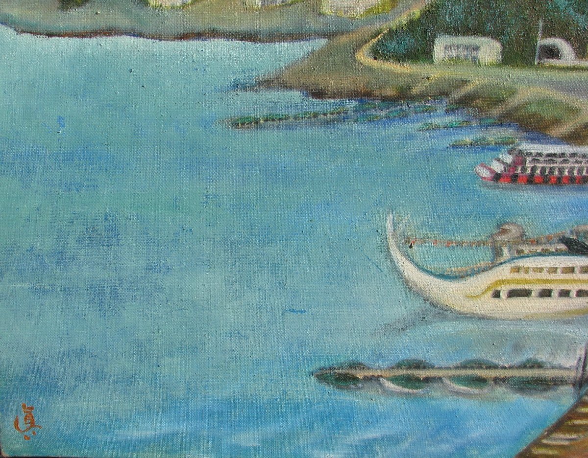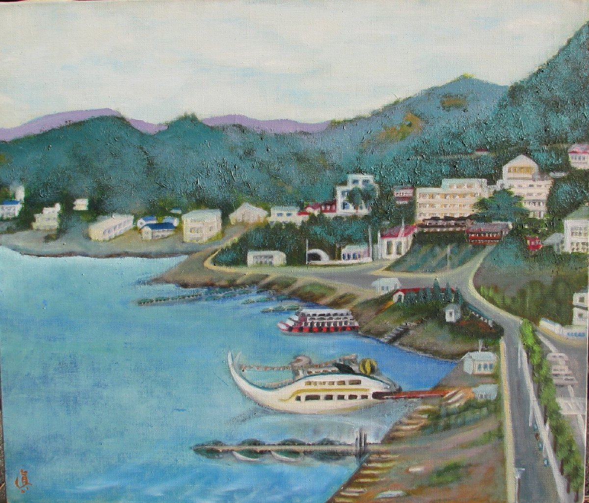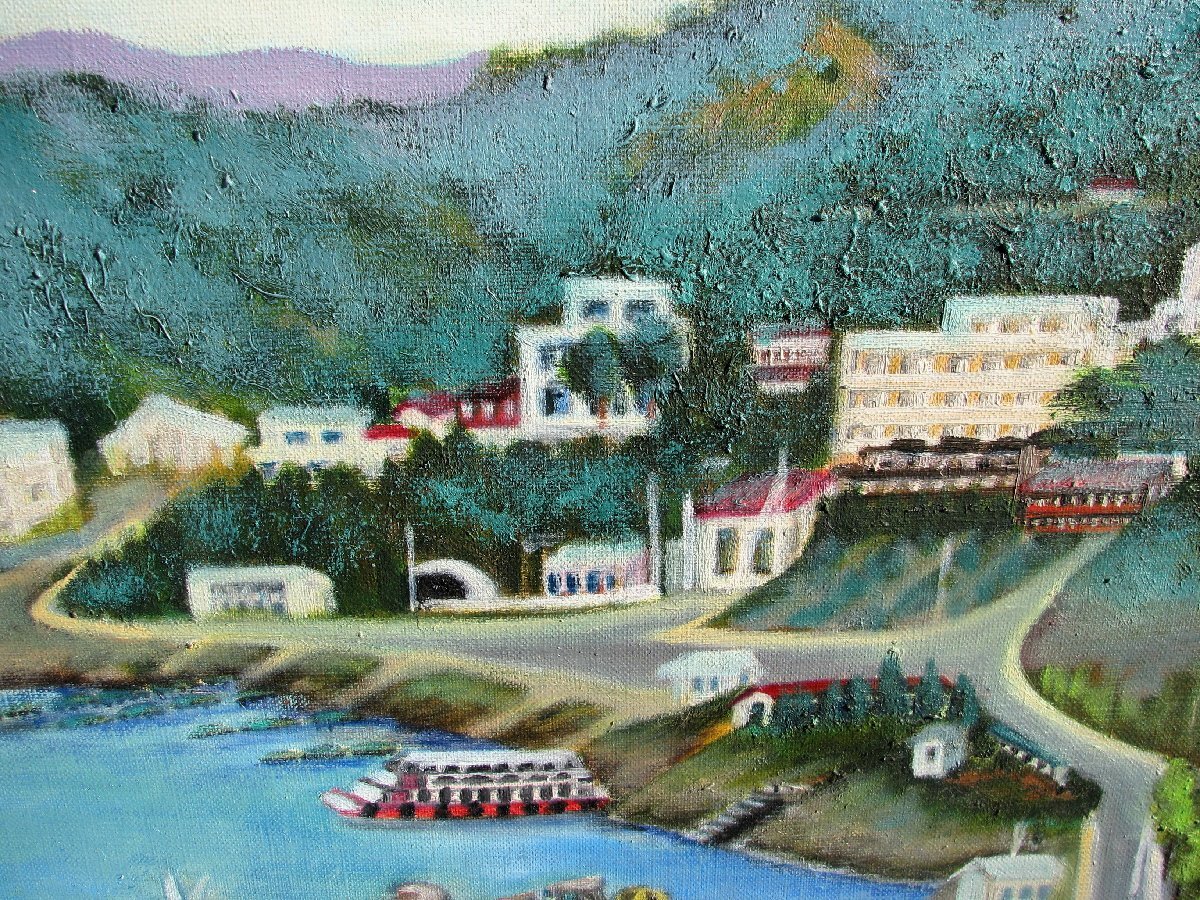 桜の女流物故作家,川島眞佐「河口湖」10号油彩,1989年,良き時代の河口湖のパノラマ風景